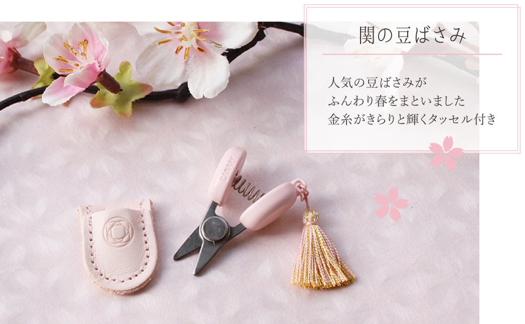 老舗刃物メーカーが作った全長35mmのかわいく、切れ味の良い豆ばさみ。指でつまむように持ち、軽い力でカットができます。さくら色の絹糸と金糸の小さな房は、手作業でていねいに作られ、職人の繊細な技が光る美しい仕上がりです。はさみに合わせ、豆サイズで作られたはさみケースには、白なめしの上質な本革を使用しています。