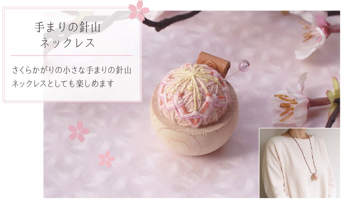 針仕事がより華やかに。さくらかがりの手まりが美しいピンクッションのネックレス。