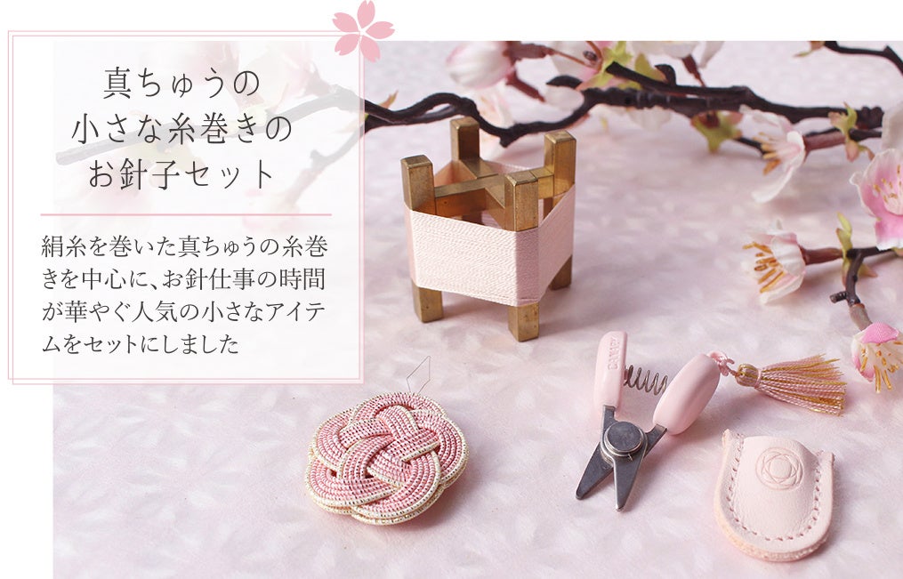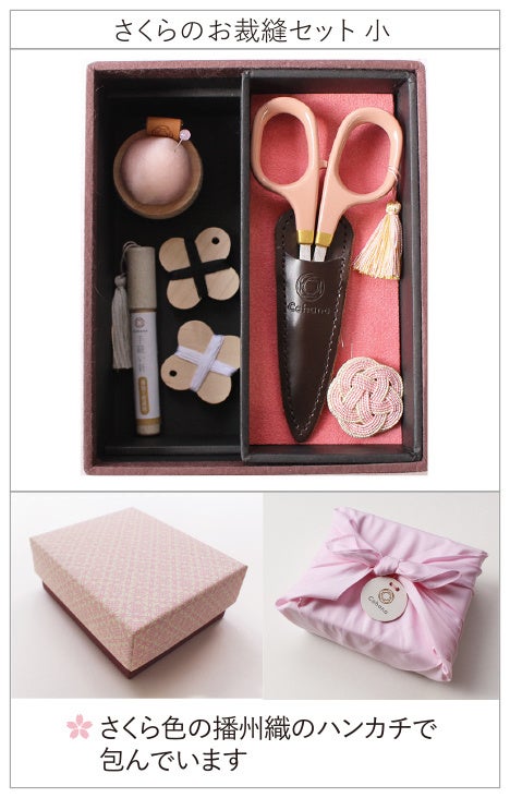 さくら色の小ばさみと限定商品が入った、コンパクトに収まるお裁縫セットです。