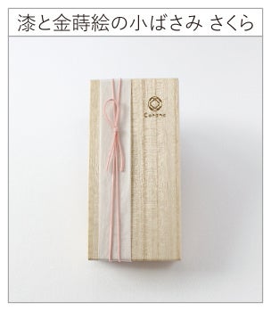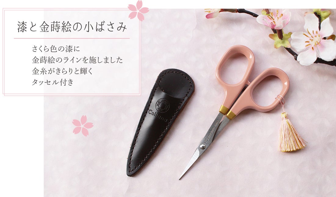 刃物の街、岐阜県関市で作られた、切れ味抜群の小ばさみに漆と金蒔絵を施しました。年月を重ねるごとに、味わい深く美しい艶があらわれ、漆独特のなめらかな質感が手にしっくりなじみます。刃先が細く鋭利な小ばさみは、こまかい作業に使いやすく、クラフト用、手芸用、どちらにもおすすめです。上質な本革ケースと、さくらと金の房がはさみをより華やかに。