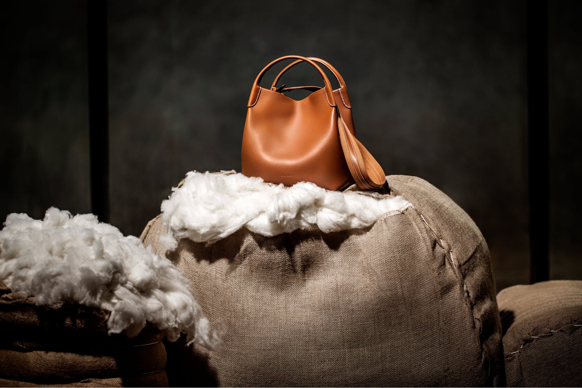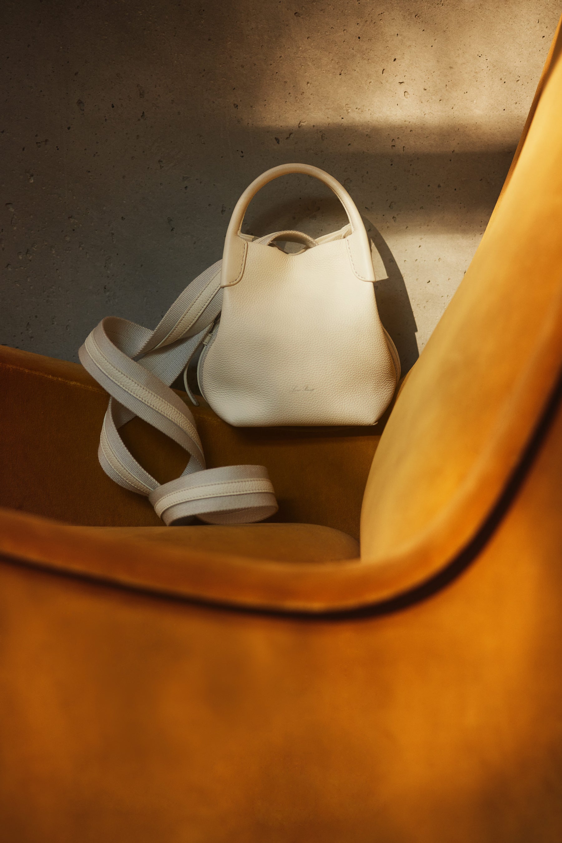 《ベイル》と名付けられたこのバッグは、ロロ・ピアーナ・ファミリーが発見した貴重な繊維の収納袋を思わせるデザインと質感を 備えています。自然で滑らかなグレインやタンブル仕上げを施したカーフスキンの精巧でしなやかな仕上がりはカシミヤの均一性を再現し、調節可能なショルダーストラップはバッグ全体を包み込み、かつて収納袋を留めるために使用されていた紐やベルトを思わせるループ状のモチーフを作り出しています。