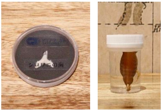「シロワニの歯」・「サメの卵殻標本(サンゴトラザメ)」