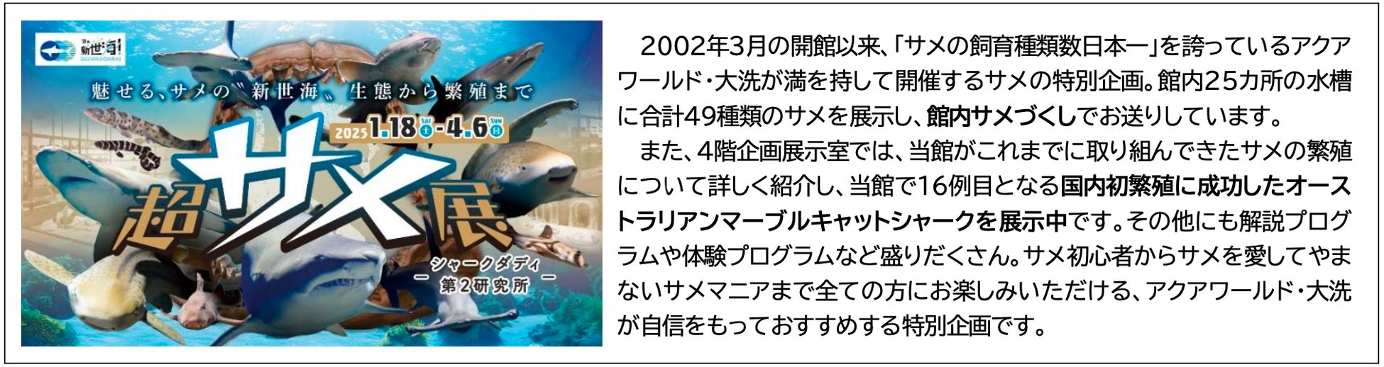 サメ好きタレントとして有名なココリコ田中直樹さんと「サメの飼育種類数日本一」のアクアワールド・大洗がタッグを組んで特別企画「超サメ展~シャークダディ第2研究所~」を盛り上げます。