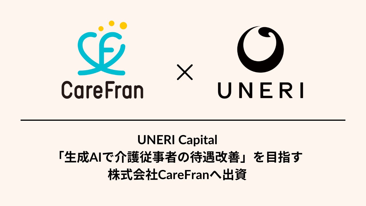 株式会社UNERI(本社:愛知県名古屋市、代表取締役:河合 将樹)は、運営するファンドUNERI Capitalを通じて、株式会社CareFran(本社:東京都千代田区、代表取締役:久保田 洋介、以下「CareFran」)への出資を実施したことをお知らせします。