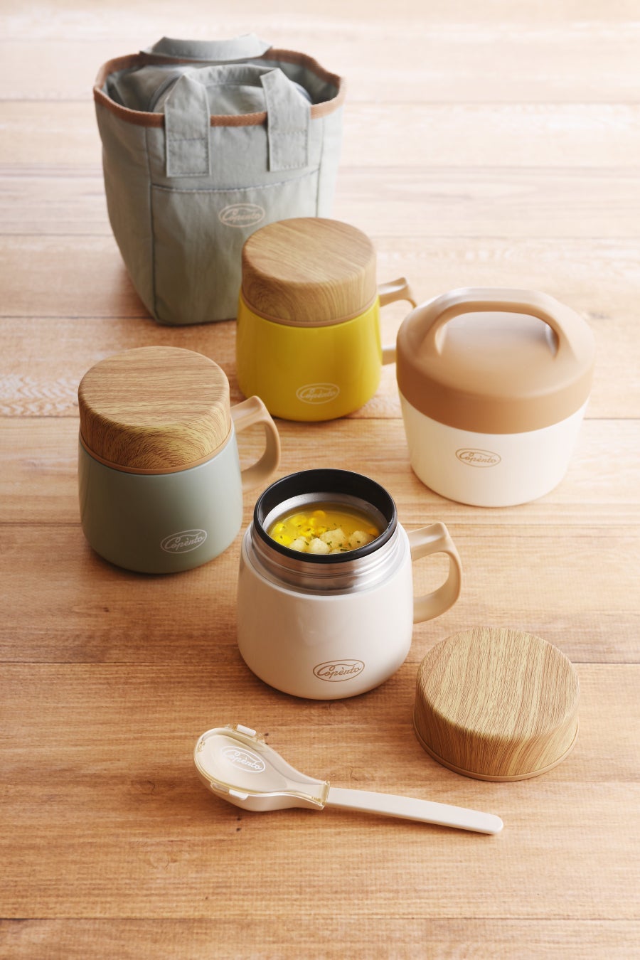 明るいカラーリングと木目調のフタがランチシーンになじみます。