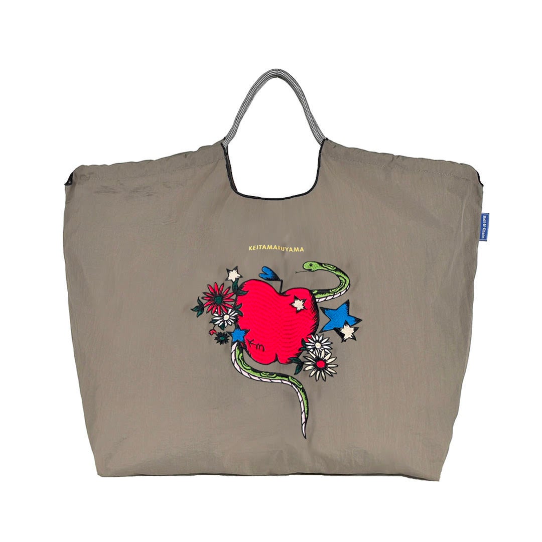 2006年春夏コレクション“FLOWER”に登場した蛇モチーフを、KEITA MARUYAMAの人気アイテム、エコバッグにアレンジ。ネイビー、グレー、ミントの3色展開です。