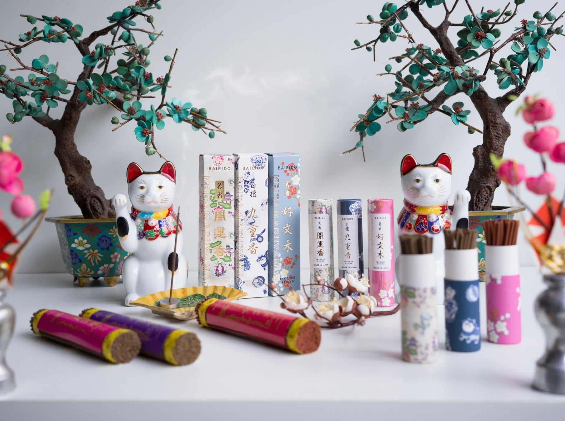 江戸時代より360年以上続くお香、お線香のメーカー株式会社 梅栄堂とコラボレーションしたのは、KEITA MARUYAMAデザインのオリジナルパッケージのお香。梅栄堂を代表する唯一無二の銘品である「九重香」「好文木」「開運香」の3種のお香が、それぞれ2タイプのオリジナルパッケージに収められた、計6種でお目見えいたします。