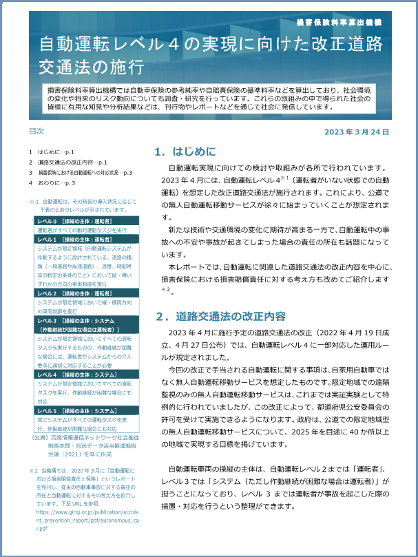 本レポートでは、自動運転に関連した道路交通法の改正内容を中心に、損害保険における損害賠償責任に対する考え方もご紹介します。
