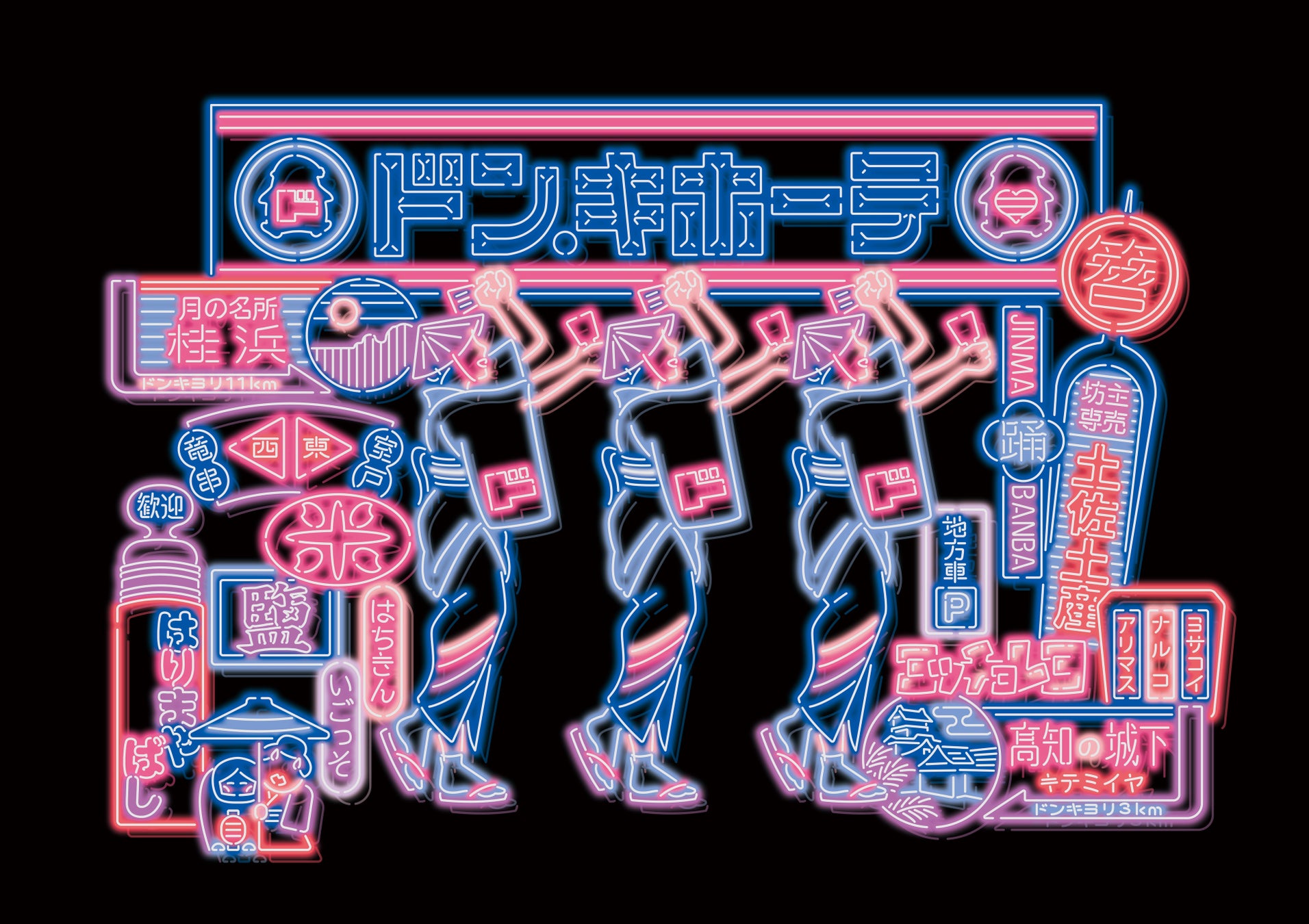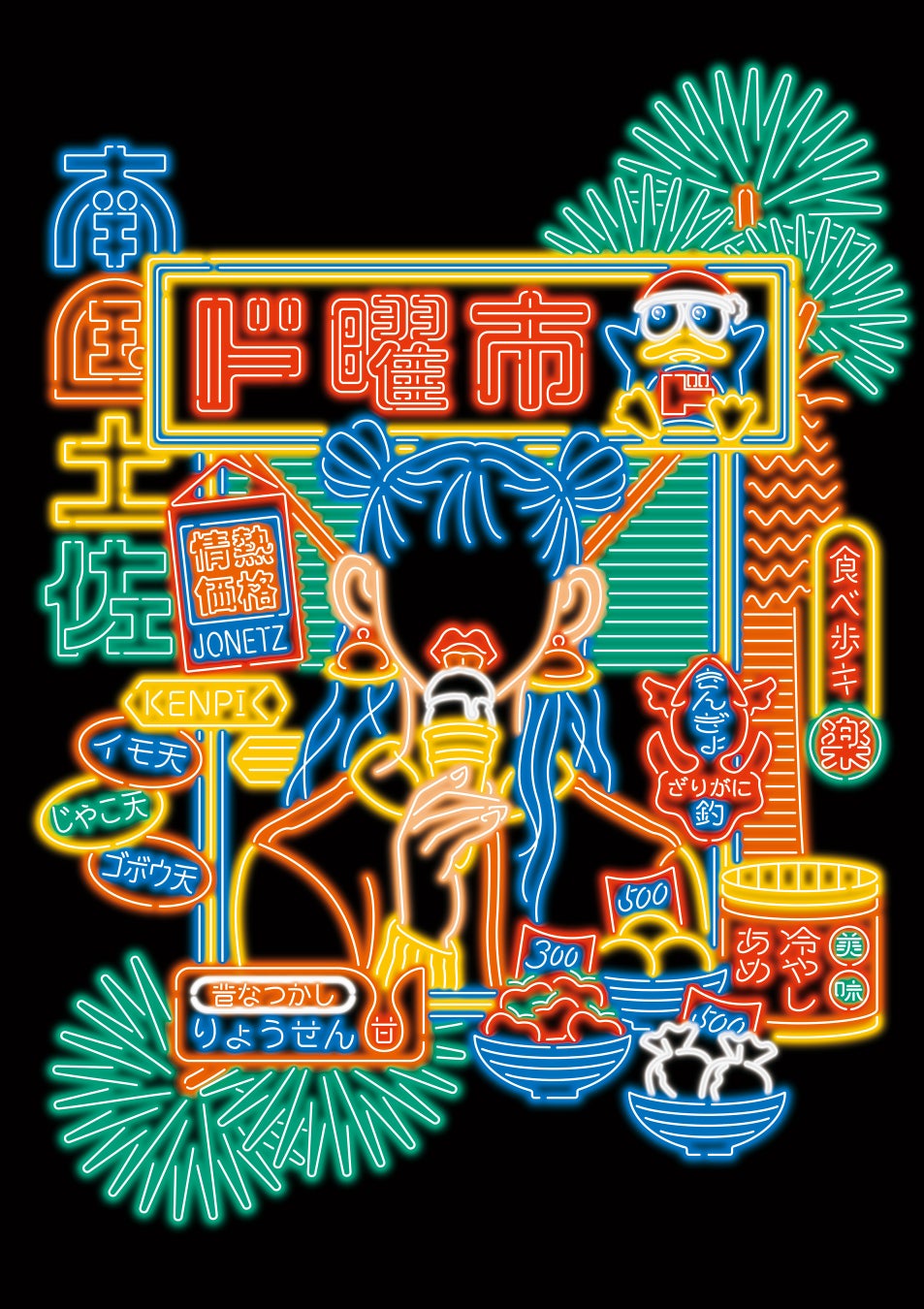 ・高知県内で週ごとに開催されている街路市(日曜市など)からインスピレーションを得ており、ドン・キホーテの「ド」を用いて「ド曜市」としています。中央の女性が舐めているのは高知名物「アイスクリン」。周囲のモチーフは街路市で売られているものやそれを連想させるものです。ドン・キホーテと街路市に共通する「買い物の楽しさ」を描きました。