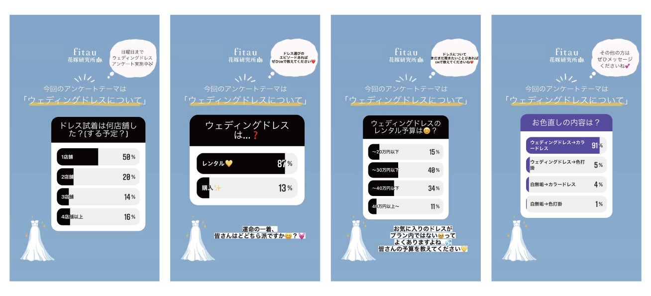 アンケート方法はインスタグラムのストーリーズを用いていますが、性質上(回答後その時点でのアンケート結果がパーセンテージで表示される)、プレ花嫁にとって興味深い質問は回答が集まり、興味がない・回答しづらい、という質問は回答数が少なくなります。