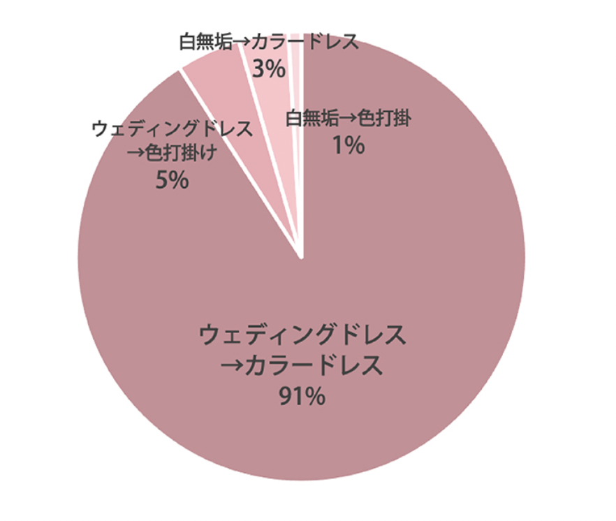 結果は「ウェディングドレス→カラードレス」の方が一番多く、全体の91%を占めた。やはりこのお色直し内容は定番なのであろう。