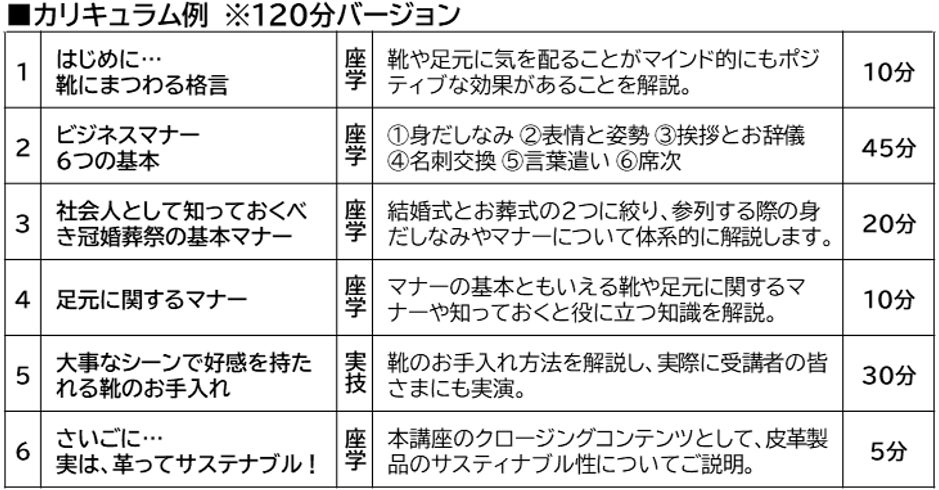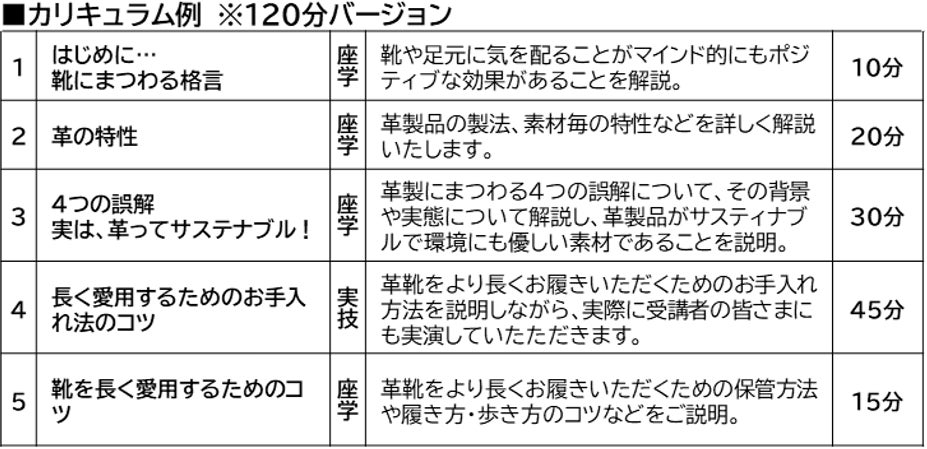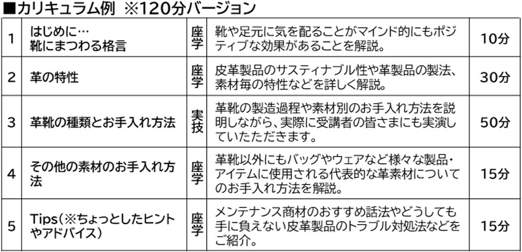 過去にも靴磨きに特化した講習などの実施実績はありましたが、今回それらの内容を再構築し、【社会人としての身だしなみとマナー】、【革製品全般に関する商品知識】そして【SDGs視点の身近な実践】というカテゴリーに分類し、“靴磨き”という意義深い実技体験を通しながら様々な知識と気づきを得ていただける全く新しい3種類の企業向け研修カリキュラムを開発いたしました。
