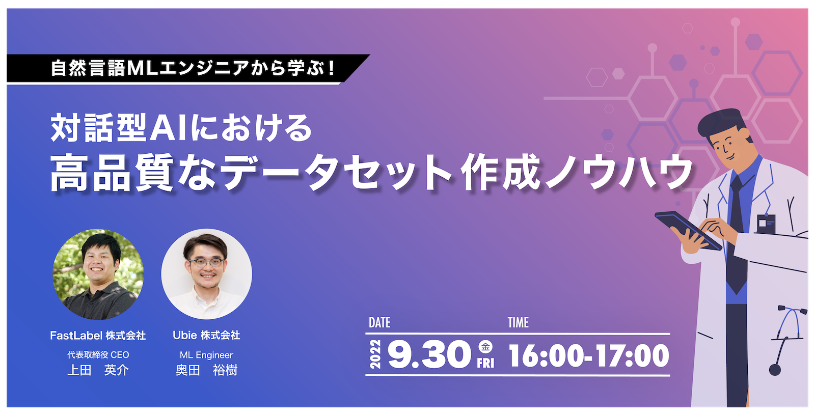 本セミナーでは、医療におけるAI問診などのサービスを手がけるUbie株式会社のMLエンジニアの奥田様にご登壇をいただき、FastLabelでデータ作成をご支援させていただいた対話型AIの構築において、特にデータ面からどのような工夫を実施して開発を行っているのか、お話をいただきます。