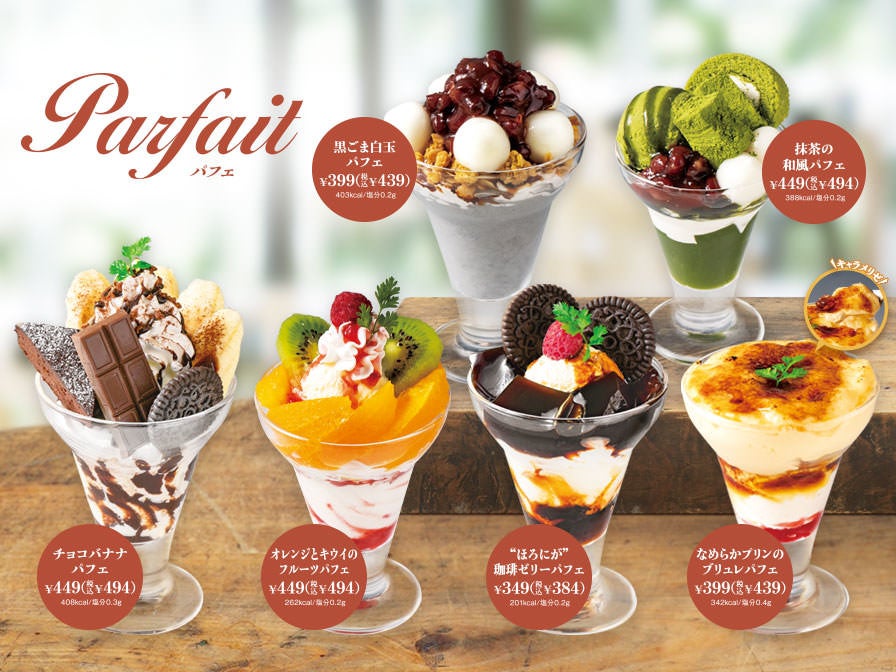 今回のリニューアルの特徴は、ケーキ類が8種、パフェ類が6種の他にミニデザートが6種、季節の商品が5種と、