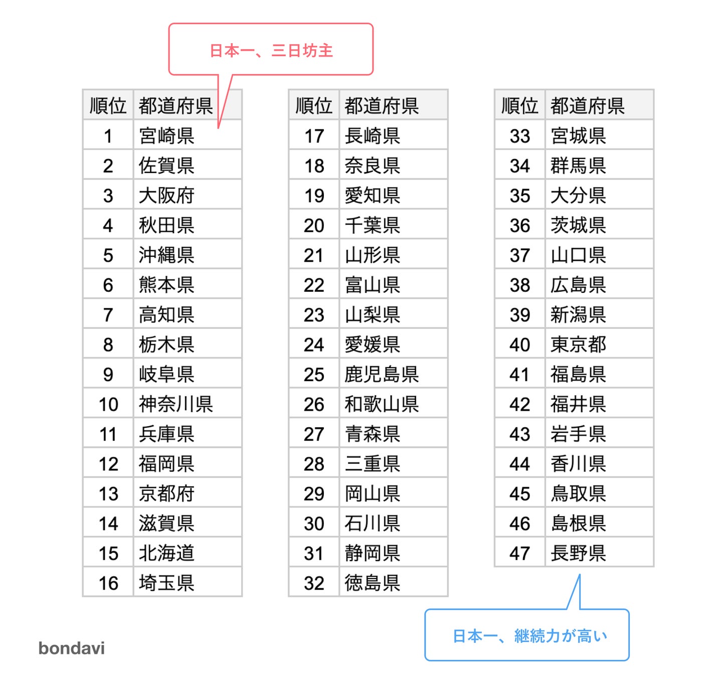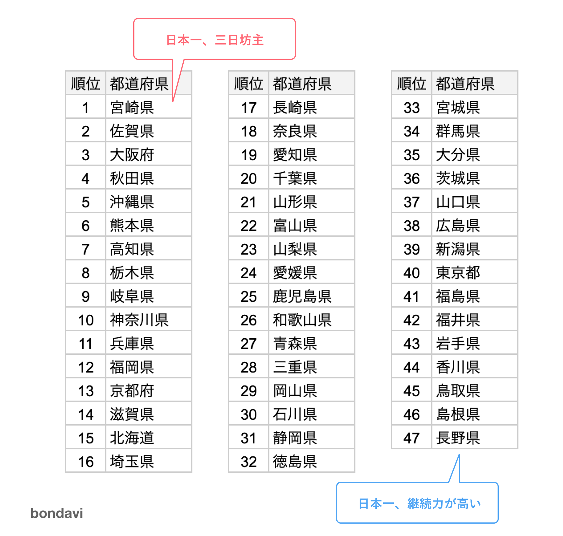 結果は、日本一三日坊主なのは宮崎県、日本一継続力が高い(三日坊主が少ない)のは長野県に。