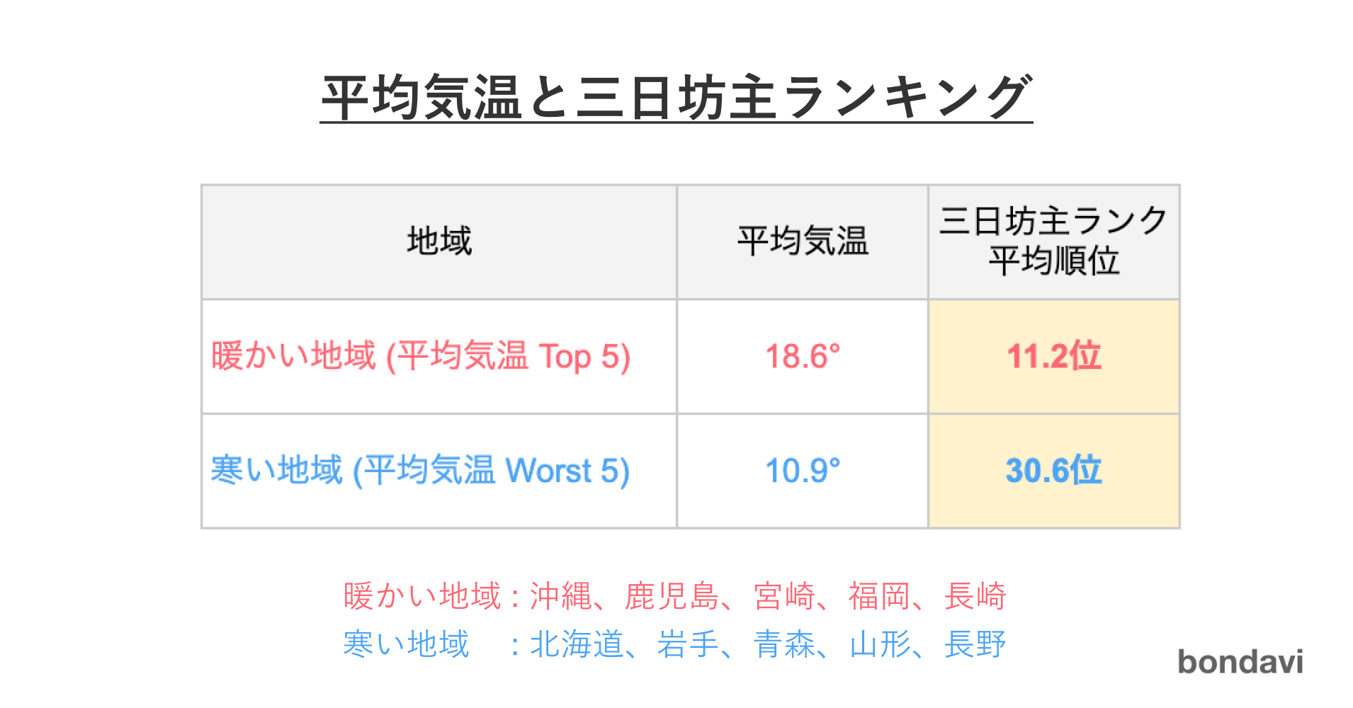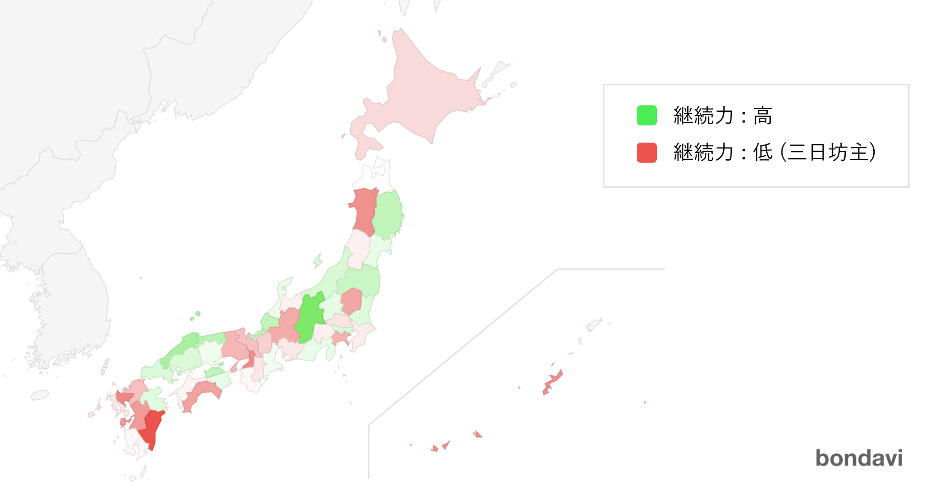 本プレスリリース用に、bondavi の代表が色分け日本地図を作成していたら楽しくなってしまい、気付いたら、平均気温や人口密度と並べて三日坊主マップが見れるようになっていました。