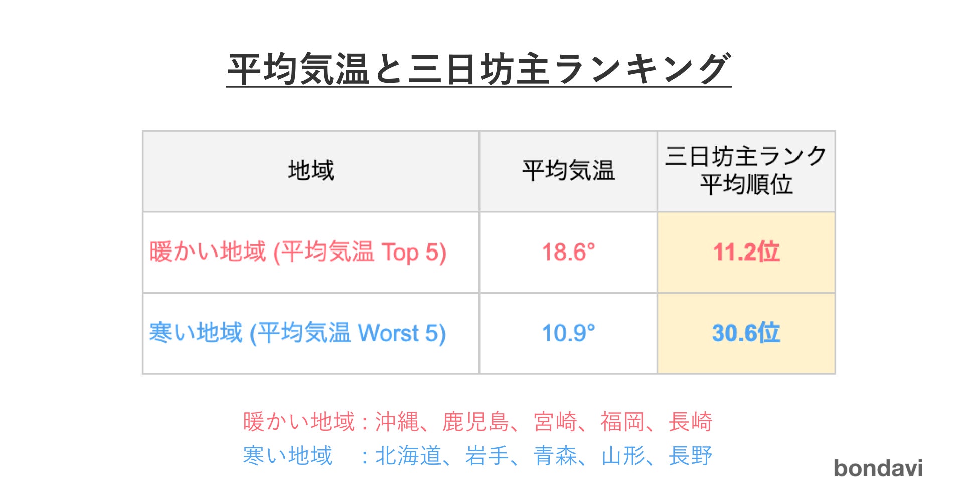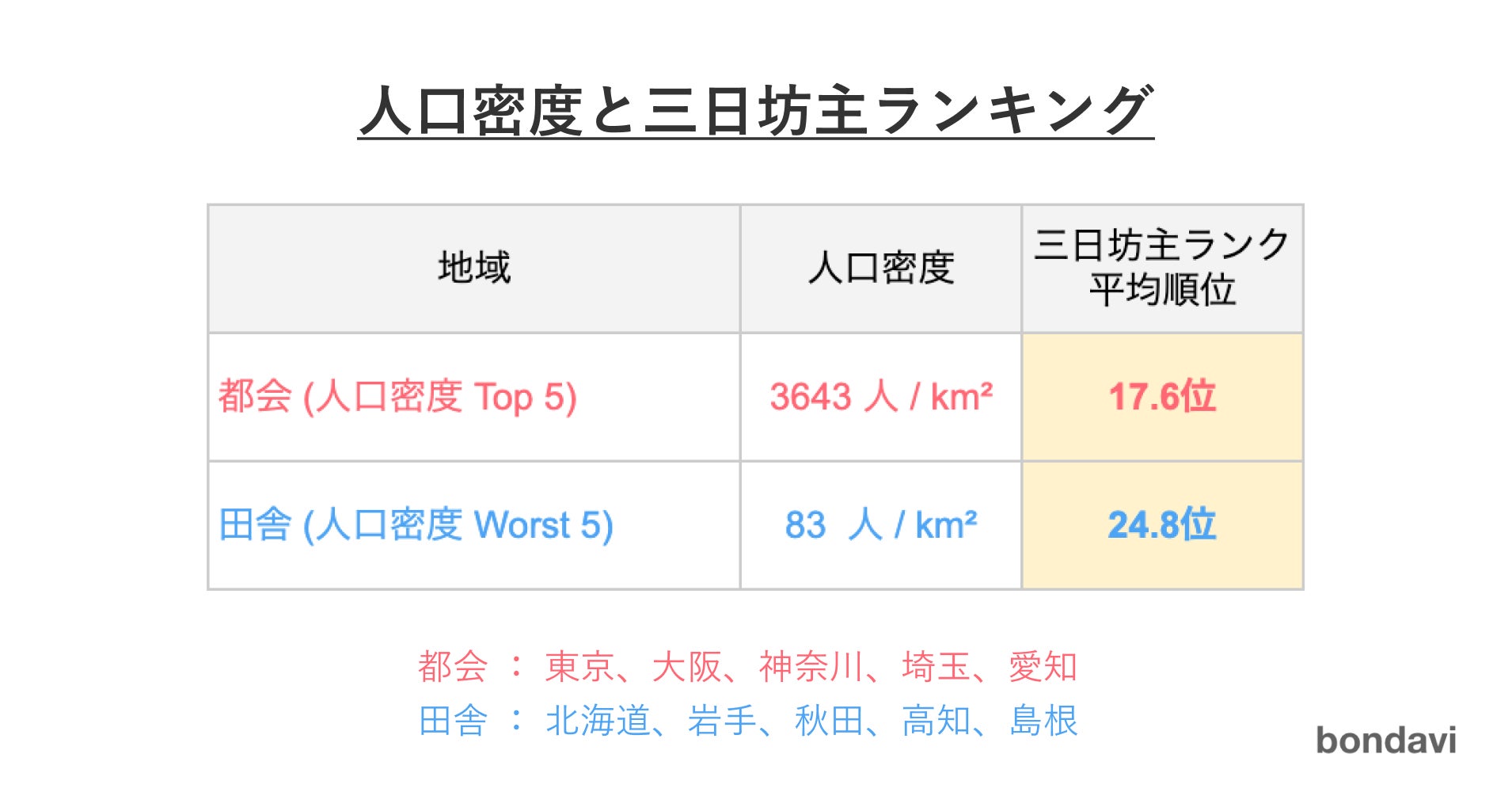 三日坊主の多い地域と少ない地域の違いを分析したところ、「都会の方が三日坊主が多い」「暖かい都道府県の方が、三日坊主が多い」といったデータが確認され、「(外出の)誘惑の多い地域ほど、三日坊主になる」という可能性が示唆されました。