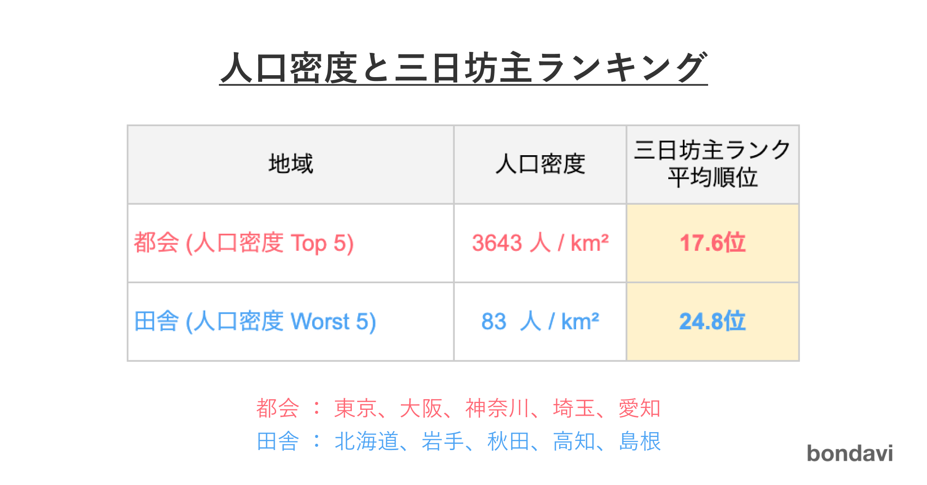 都会の都道府県の方が、三日坊主ランキングが高い(三日坊主が多い)傾向が確認されました。