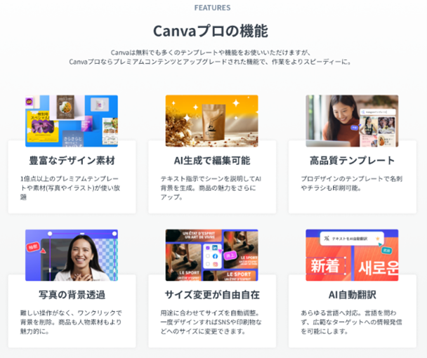 「Canvaプロ」では、1億点以上におよぶプレミアムコンテンツ(写真、動画、イラスト、テンプレート)に加え、AI関連機能や背景透過ツール、ブランドキットなど、従来の機能をすべて利用可能です。プロ品質の販促物やSNSコンテンツを手軽に制作できます。