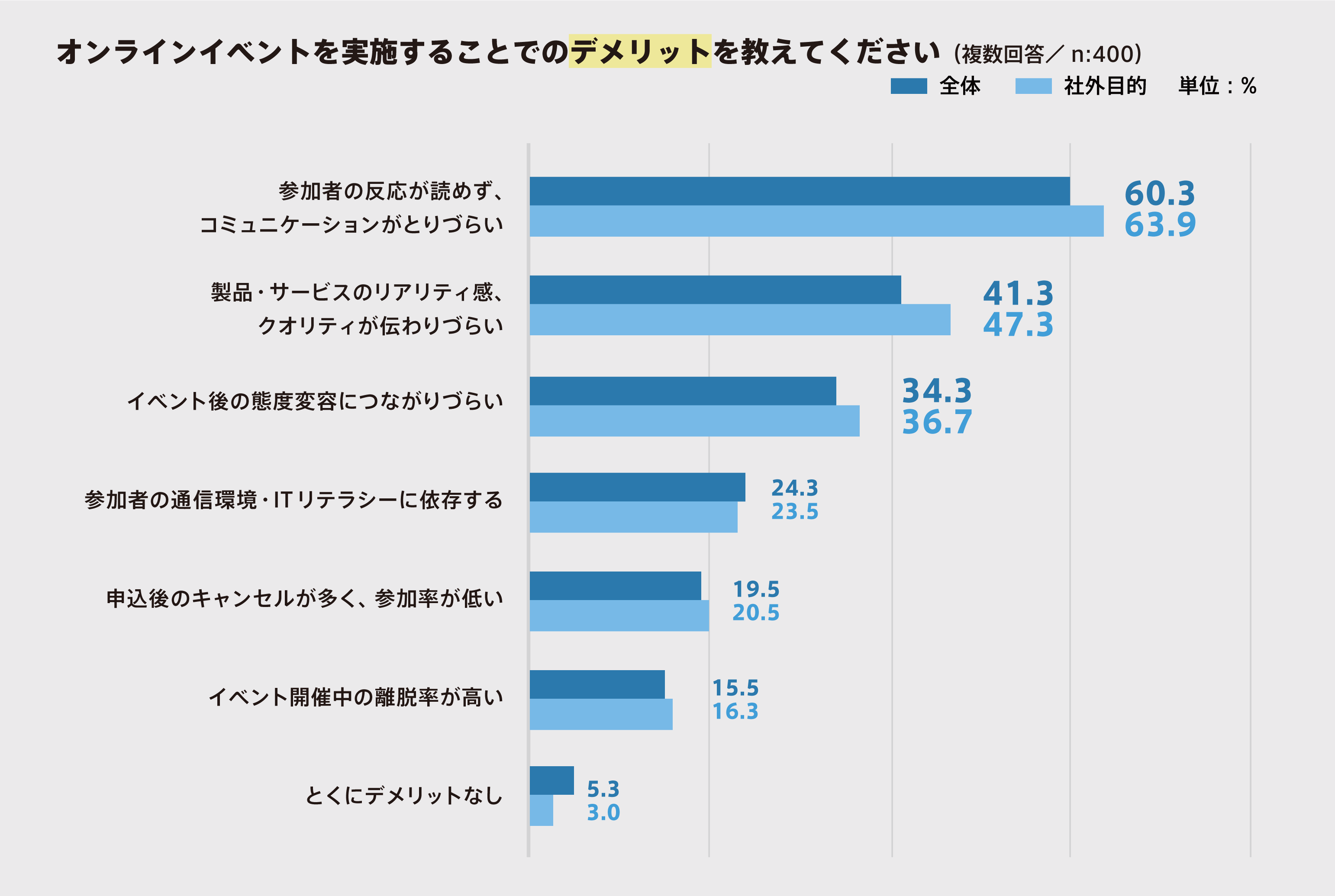 また、社外向けのイベントに絞ってみるとこの傾向がさらに顕著になり、上位3つの「コミュニケーションの取りづらさ」、「クオリティの伝わりづらさ」、「イベント後の態度変容のしにくさ」においてはデメリットと感じる割合が、全体より高い割合になっています。