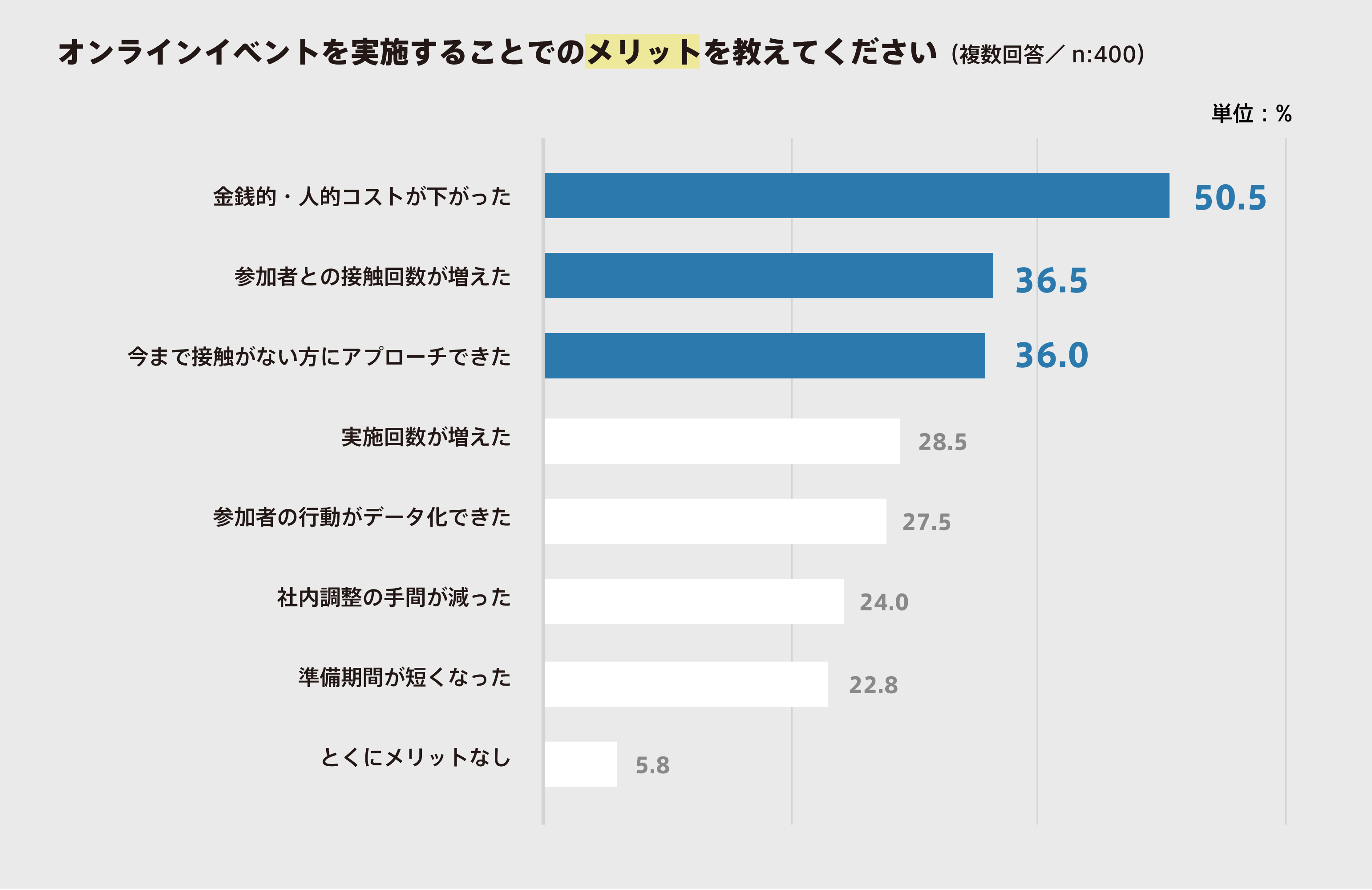オンラインイベントのメリットについて、50.5%の方が「金銭的・人的コストが下がった」と回答しました。続いて、「参加者との接触回数を増やすことができた(36.5%)」「今まで接触したことがない方にアプローチできた(36.0%)」など、場所を問わずアクセスできることによる参加者層の拡充・接点増加もメリットとして挙げられています。