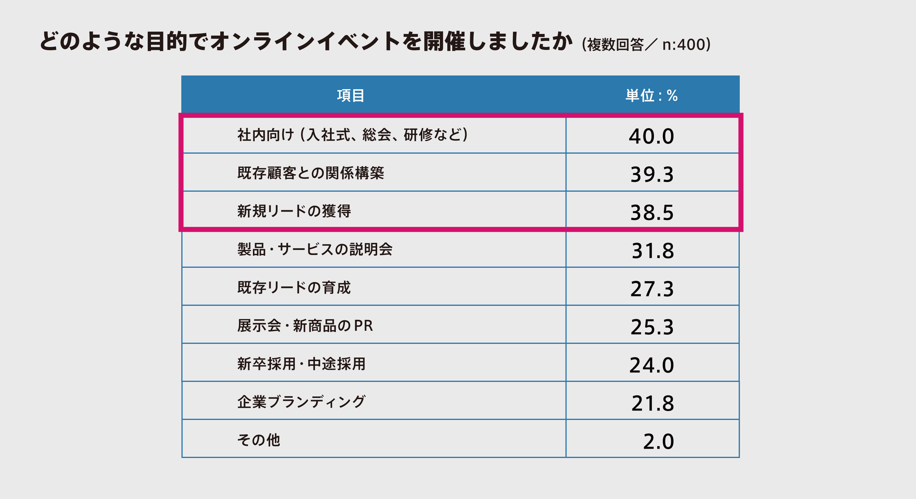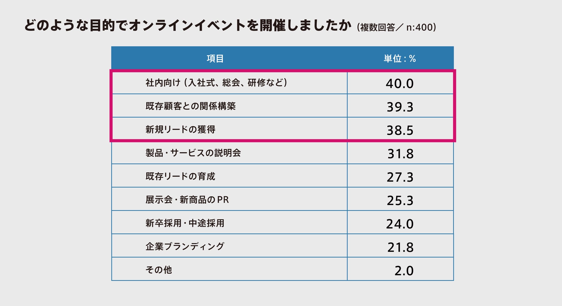 イベントの開催目的は、「社内向けのイベント(40.0%)」が多く、次に「既存顧客の関係構築(39.3%)」、「新規リード獲得(38.5%)」と続きました。社内外問わず様々なイベント形態において、オンラインでの実施が定着しつつあることがうかがえます。