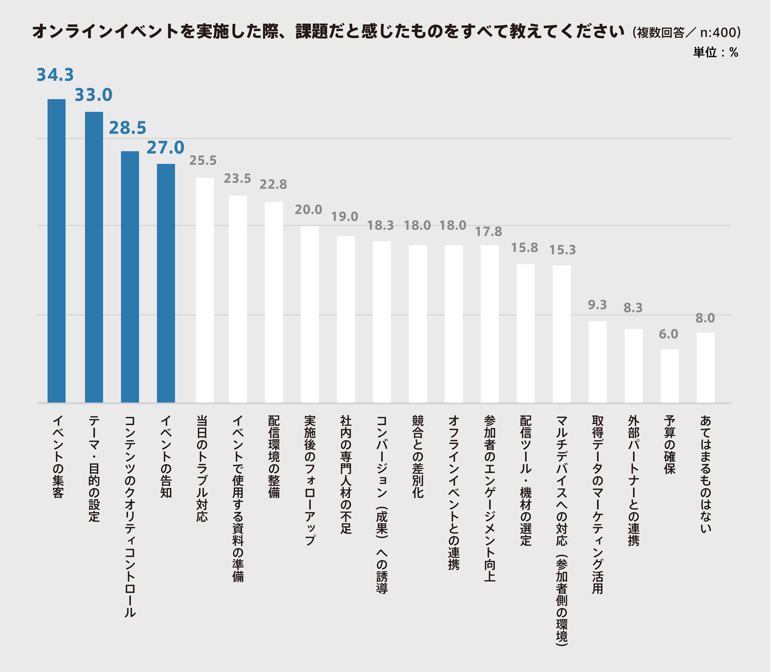 - オンラインイベントの課題は、「イベントの集客(34.3%)」「テーマ・目的の設定(33.0%)」「コンテンツのクオリティコントロール(28.5%)」