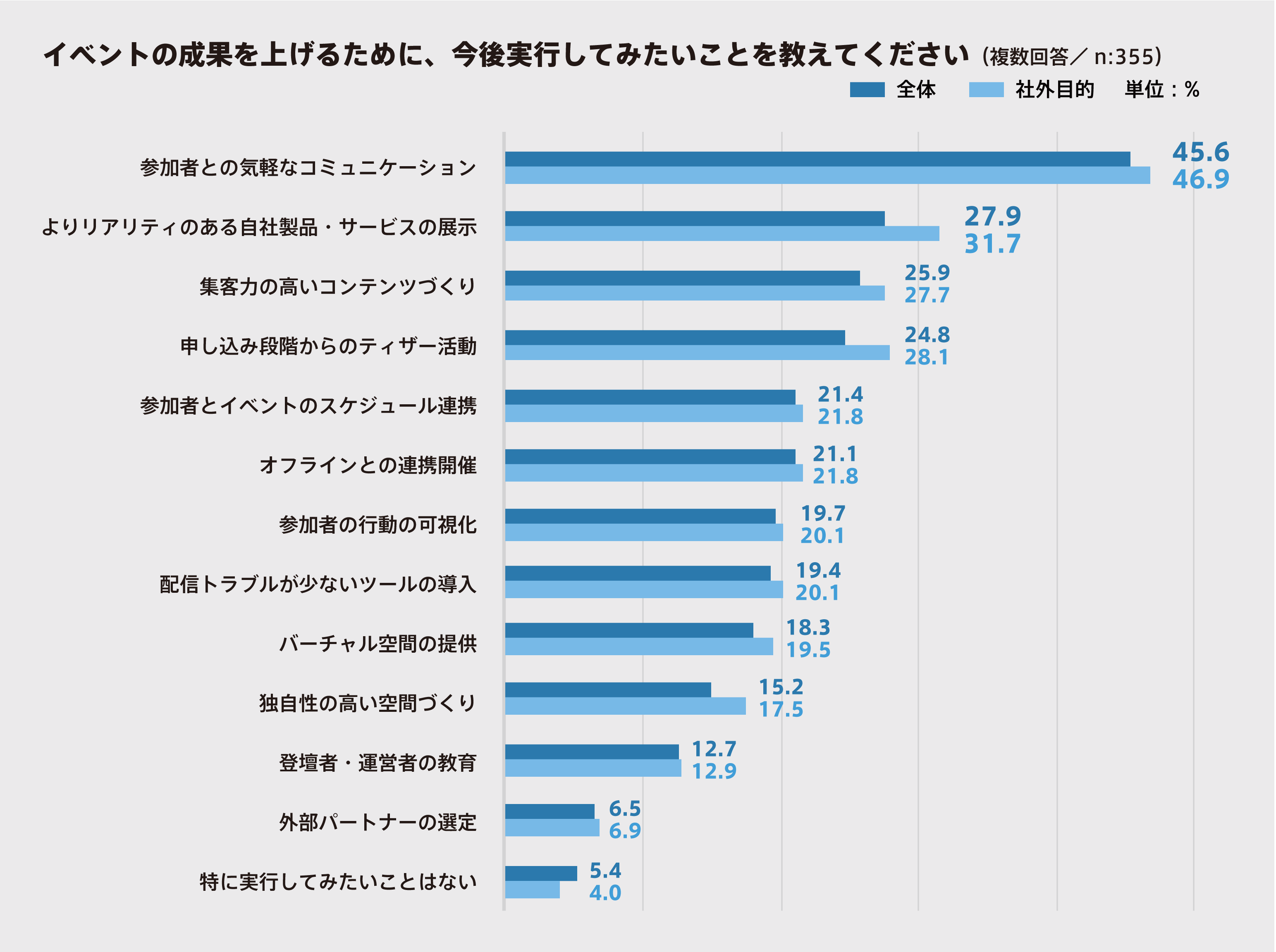 また、今後のオンラインイベントで実行してみたいことを聞いたところ、「参加者との気軽なコミュニケーション(全体:45.6%/社外目的:46.9%)」や「リアリティのある自社製品、サービスの展示(全体:27.9%/社外目的:31.7%)」が上位にあがってきました。今までオフラインで自然にできていたことを、いかにオンラインでも実現させることができるのかが重要になってくるといえます。オンラインイベント運営でも「コミュニケーション」と「リアルを再現する」の両軸を追求していくことで、より参加者とのエンゲージメントを強くしていくことが求められる結果となりました。