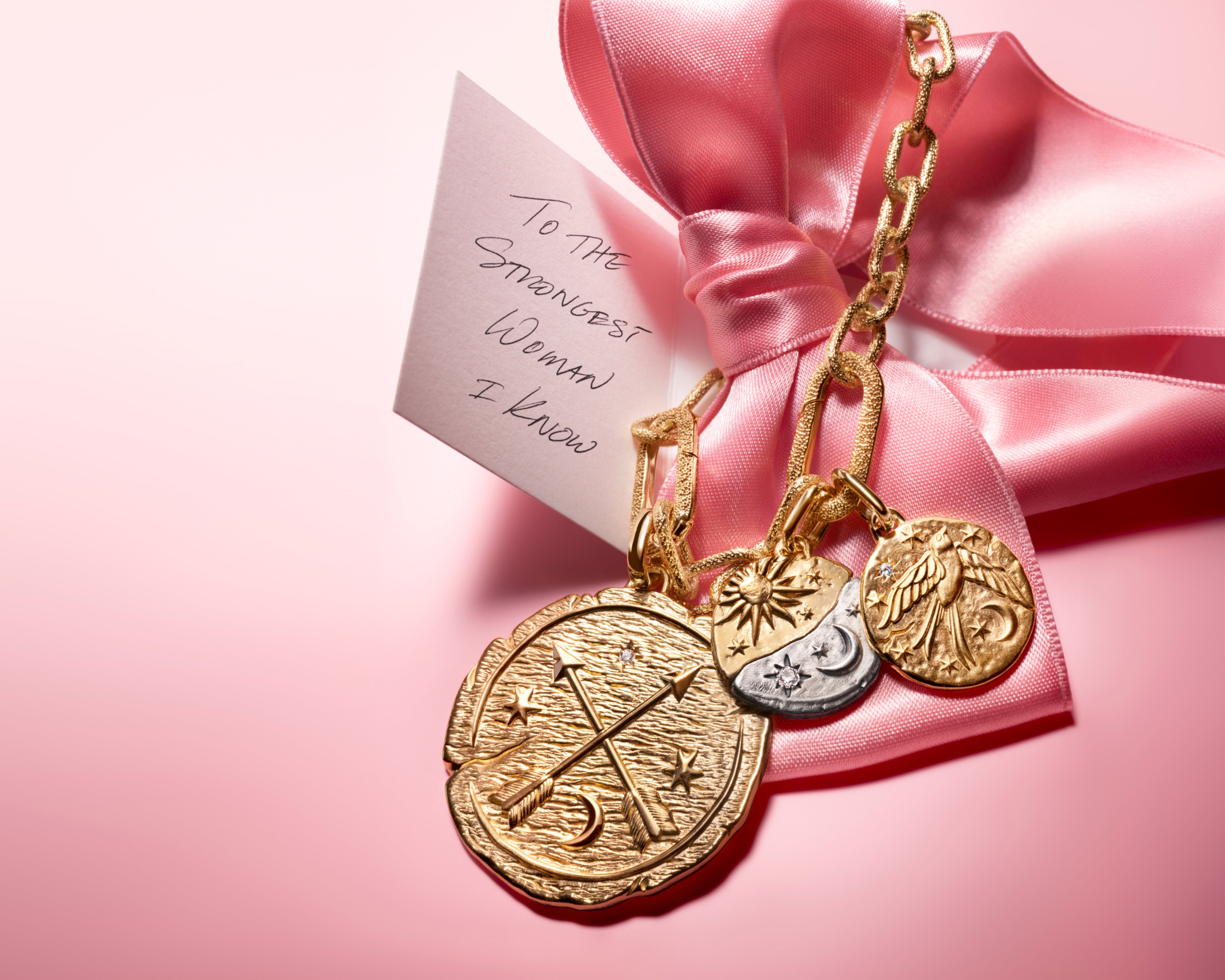 三日月を模したスターリングシルバー製のチャームには、星形のストーンが埋め込まれています。裏面には「THE SKY IS THE LIMIT」と刻印されており、大きな夢を持ち、限界を超えて挑戦することを思い出させてくれます。