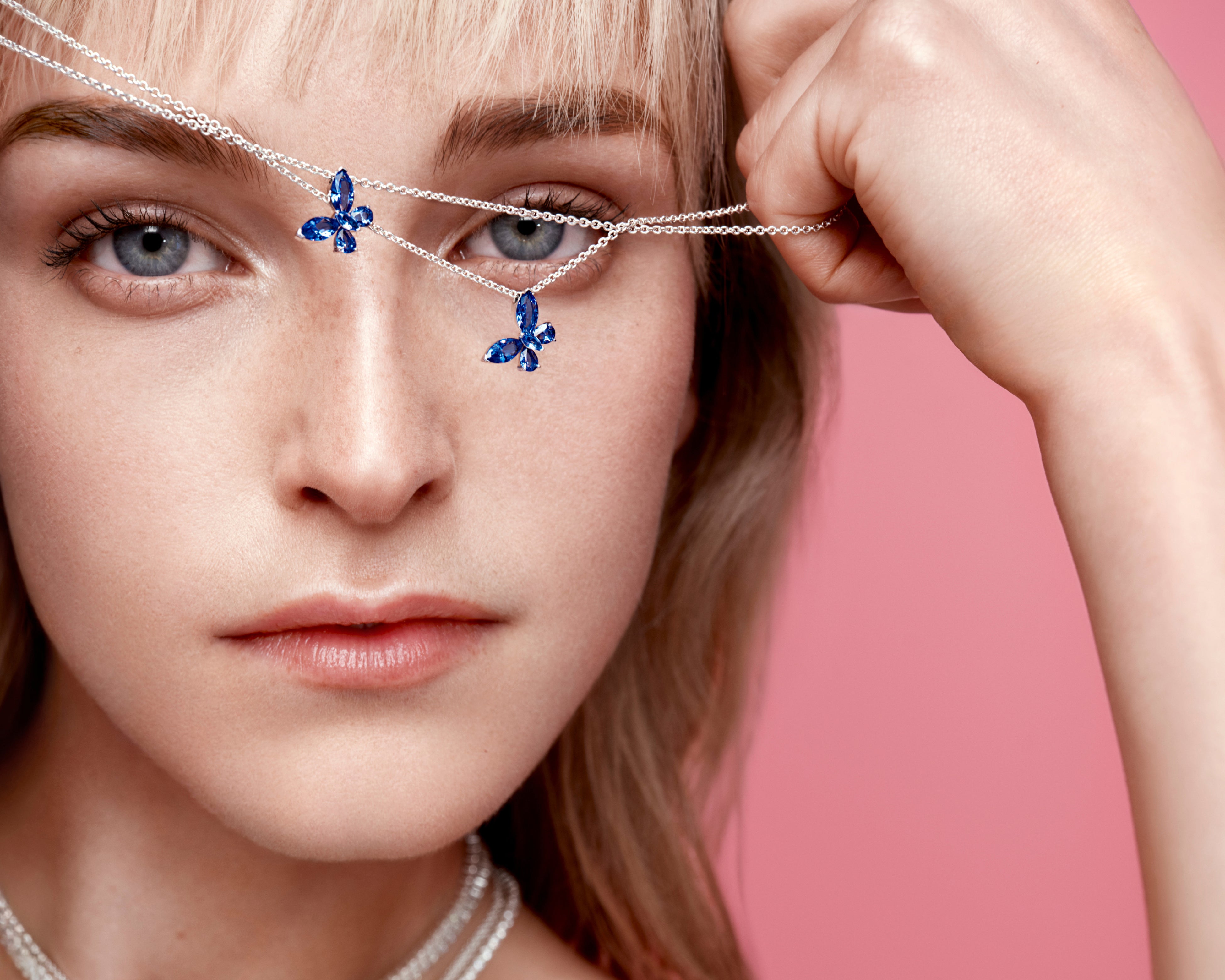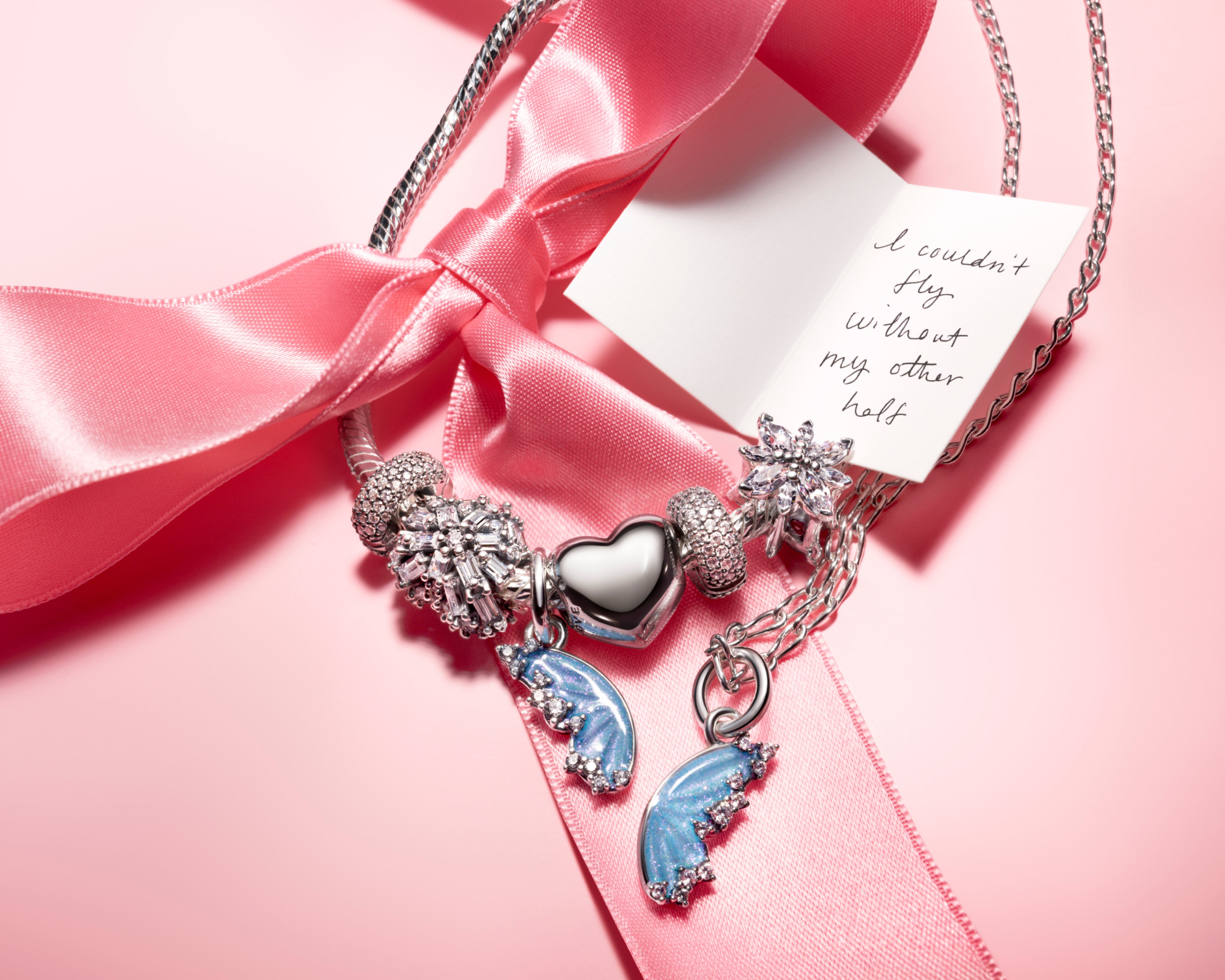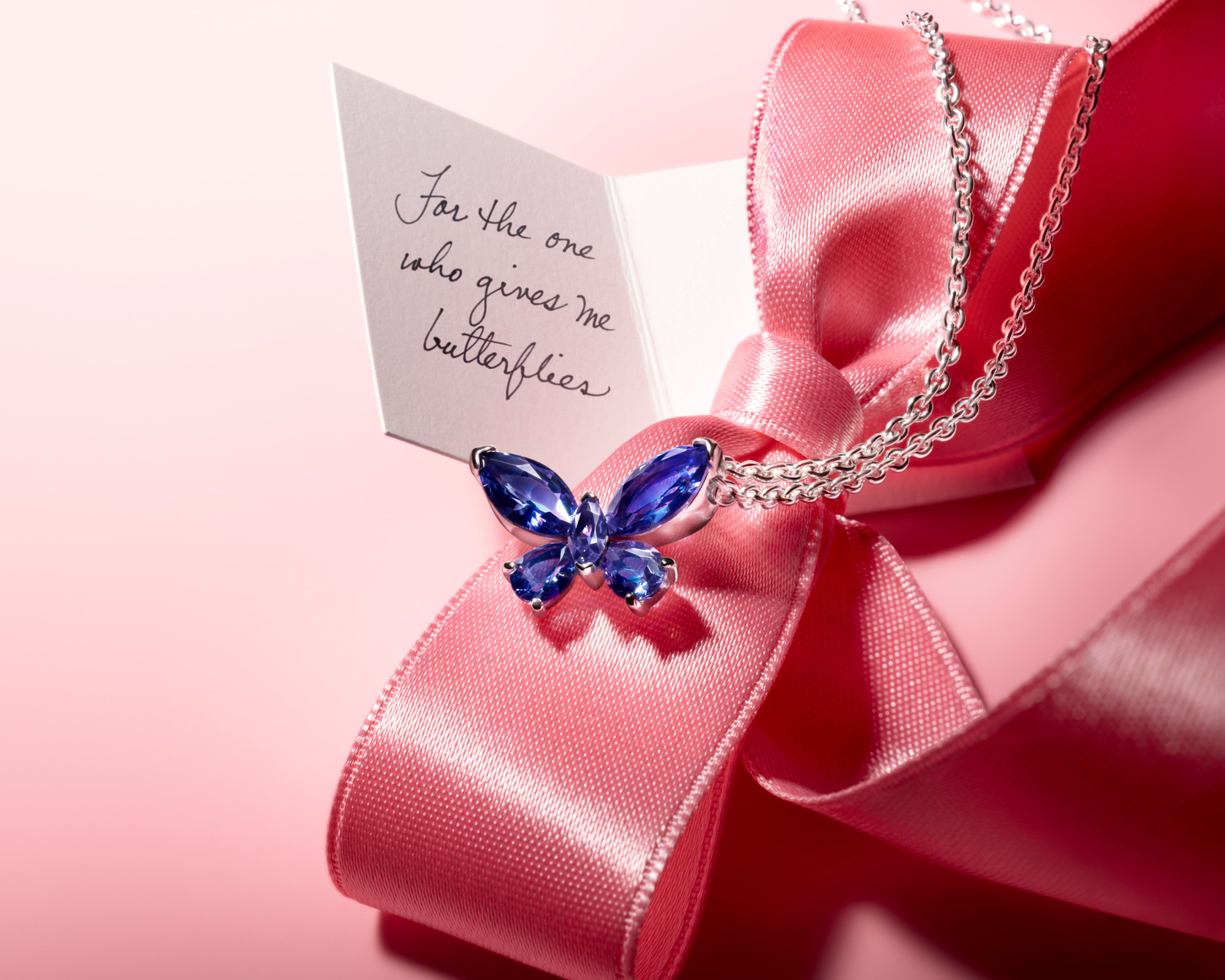 輝く蝶の羽の前面にはきらめくキュービックジルコニアと輝くブルーエナメルが施され、裏面には「TOGETHER ABOVE ALL」と刻印されており、2枚の羽がセットとなったチャームが友人や大切な人とのつながりを表現しています。