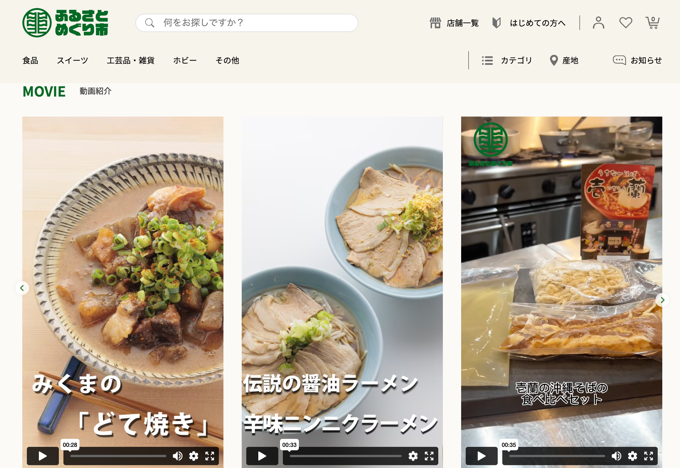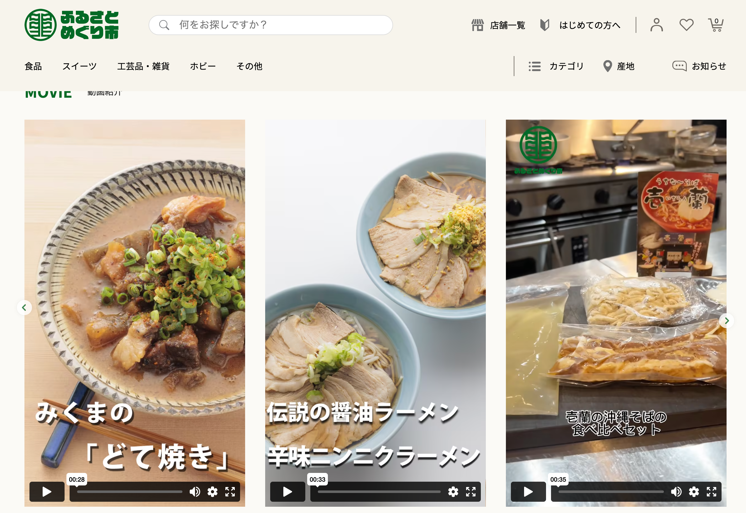 サイト内はオススメ商品の動画やピックアップ商品、新着商品、店舗紹介など、お探しの商品を見つけやすく、購入までの導線もシンプルでわかりやすくなるように画面デザインも大幅変更。今まで以上に使いやすく快適になった『ふるさとめぐり市』。もちろん、ここにしかない新しいアイテムも続々登場、随時更新中です。