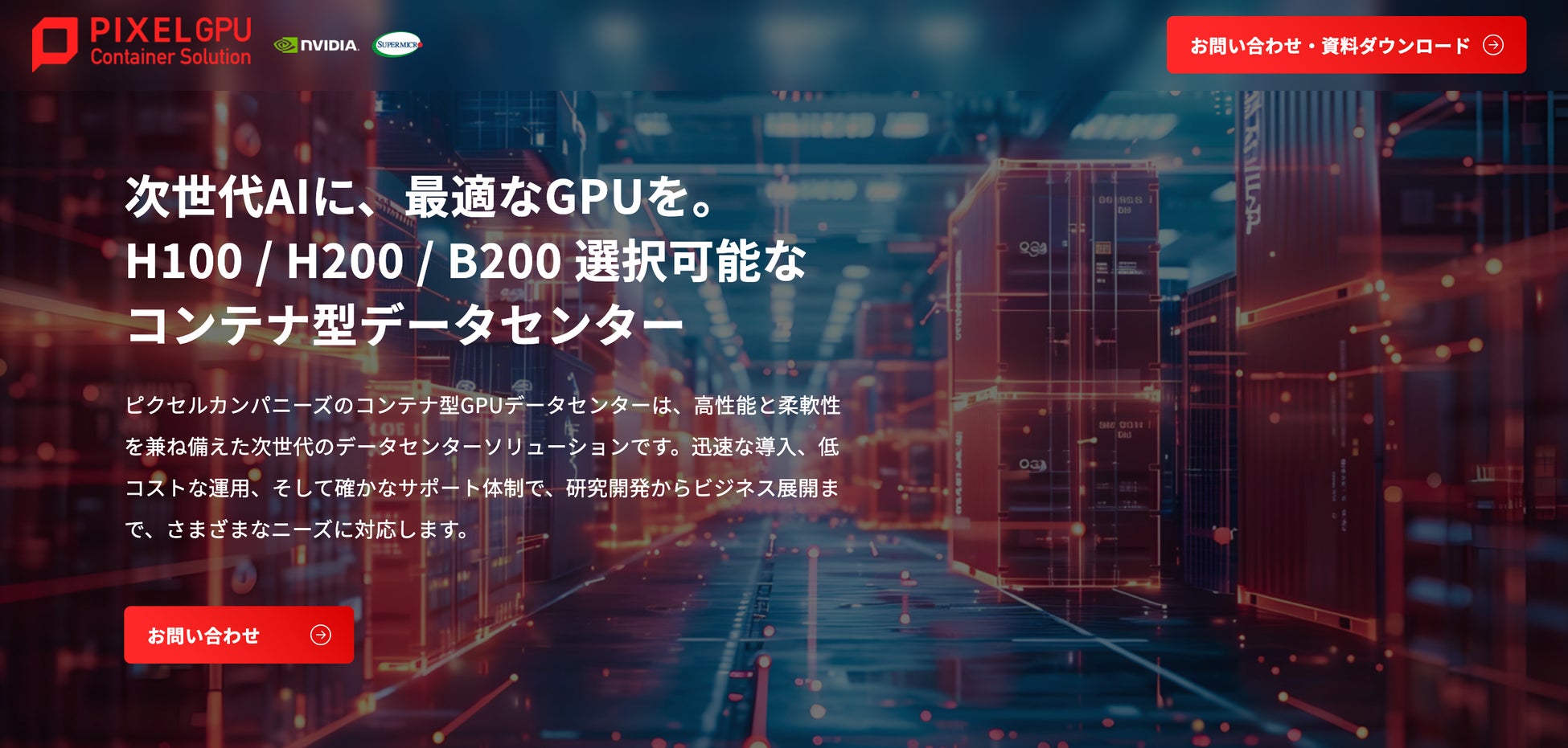 ピクセルカンパニーズ株式会社(本社:東京都港区、代表取締役:矢尾板 裕介、以下ピクセルカンパニーズという)は、同社が提供するコンテナ型データセンターサービスにおいて、NVIDIAの最新GPU「H200」「B200」に対応した構成を新たに提供開始したことをお知らせします。これにより、従来対応していた「H100」に加え、計3種の最新GPUを用途に応じて選択できる柔軟なサービス体制を実現しました。
