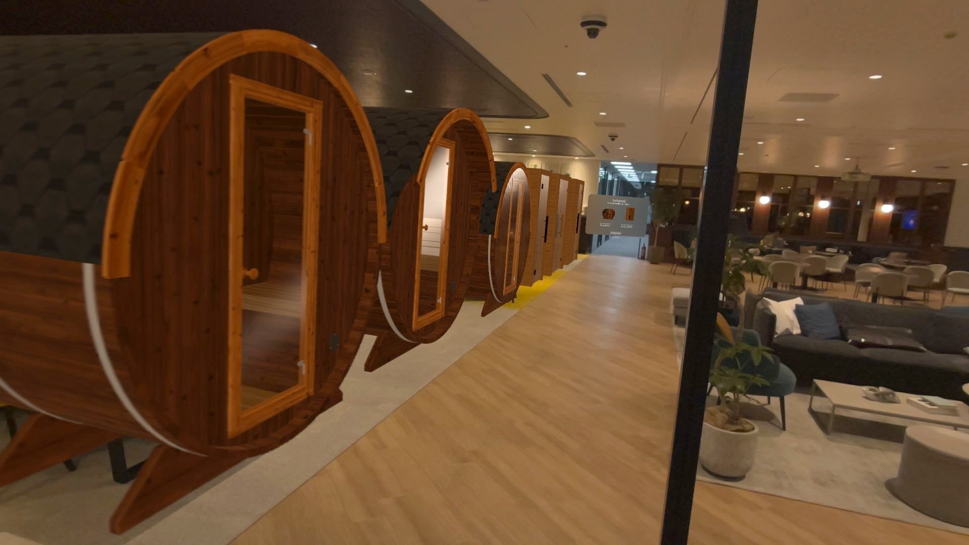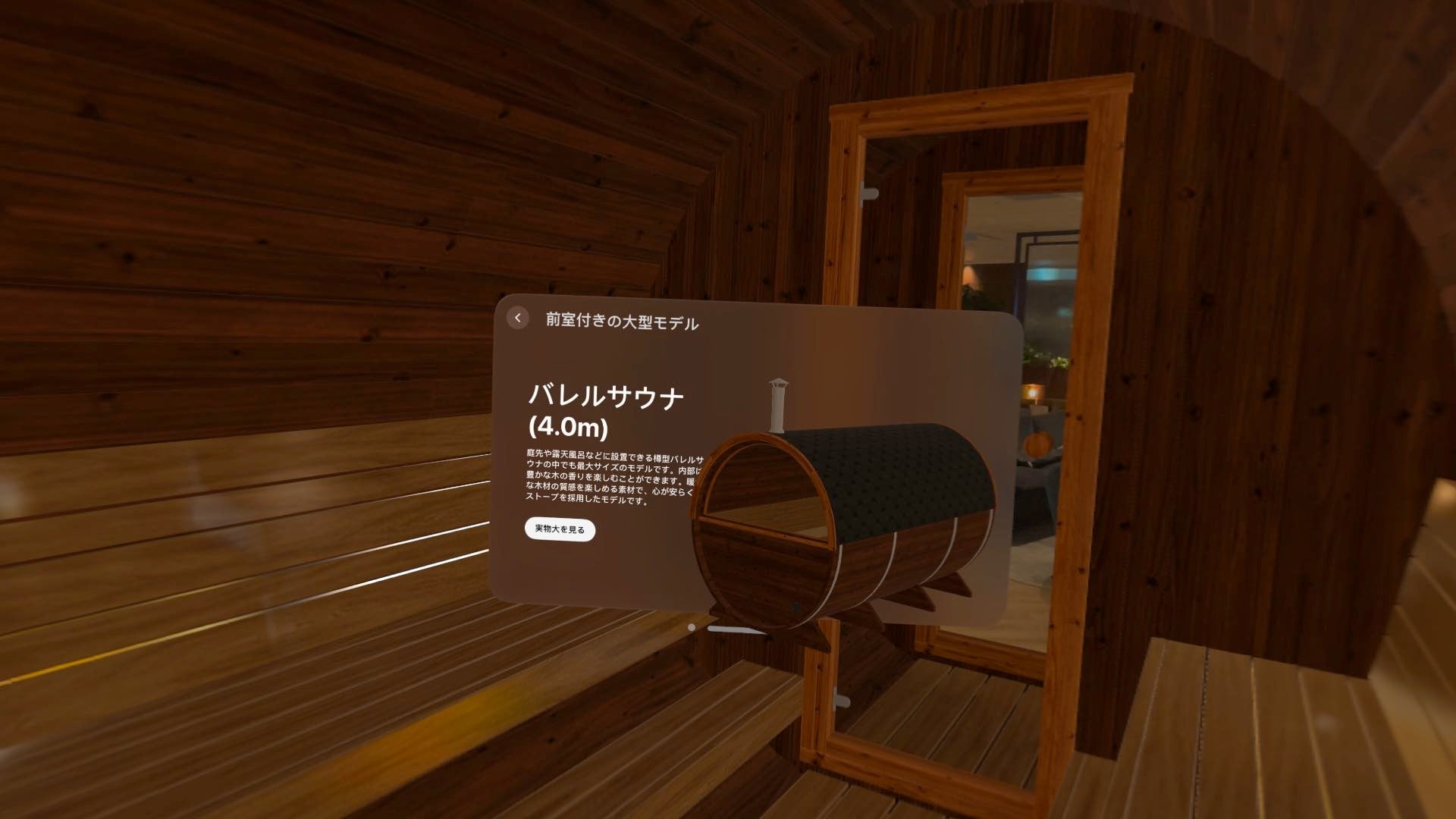 ボタンを押すと、実物大のサウナがバーチャル空間内で展開。実際に中に入って大きさや空間の感覚を体験することも。
