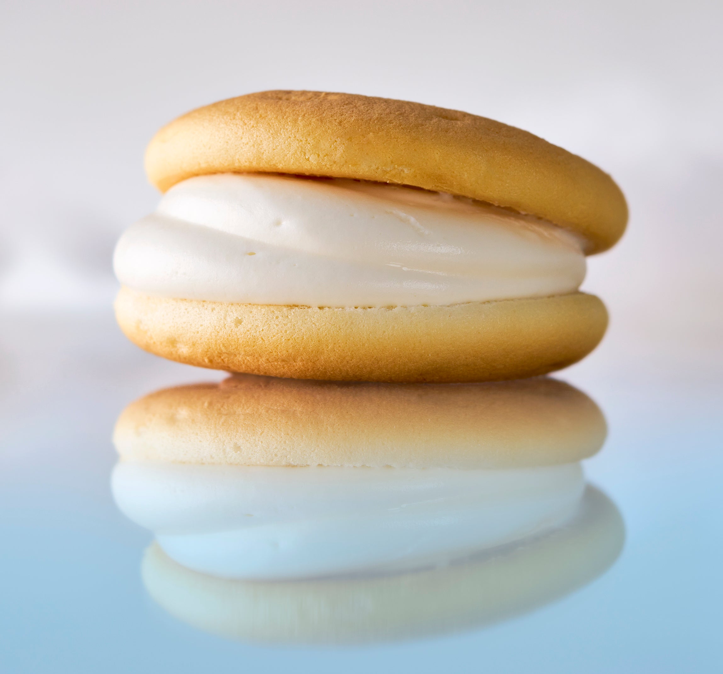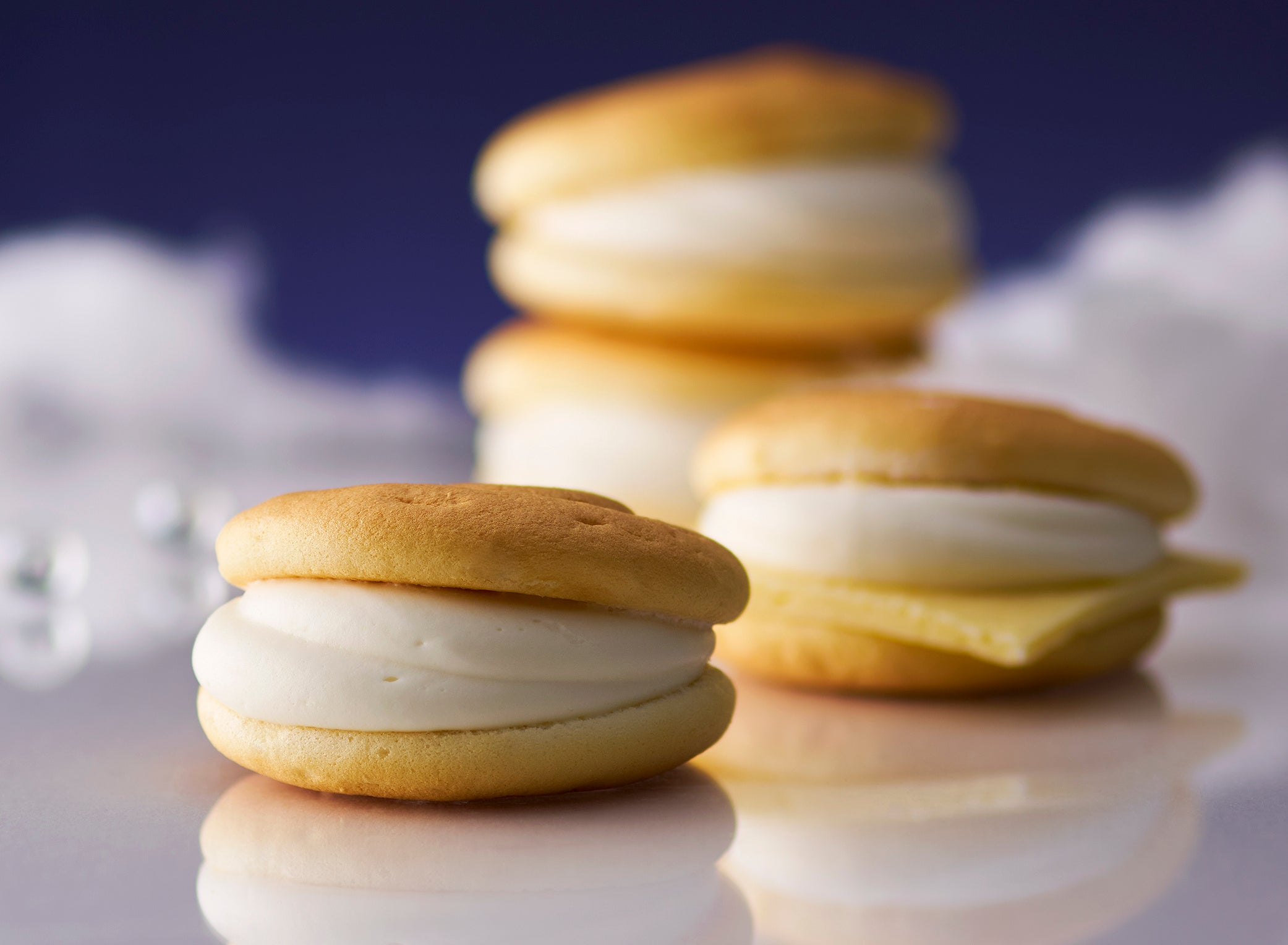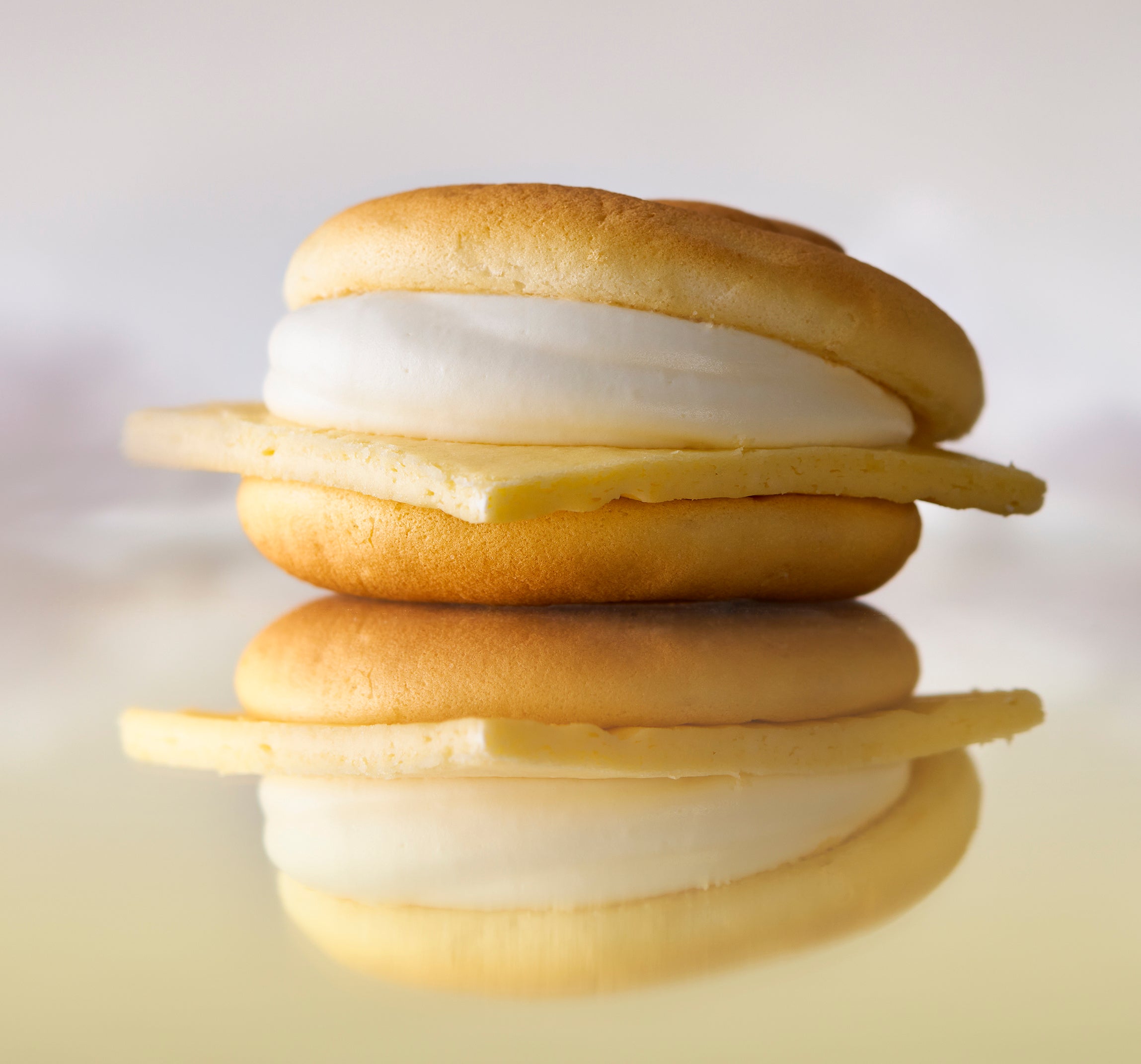 「ゆきむしスフレ」ならではのふわっとした食感のスフレにクリームをサンドして、チーズバーガーのよ うに召し上がっていただきます。