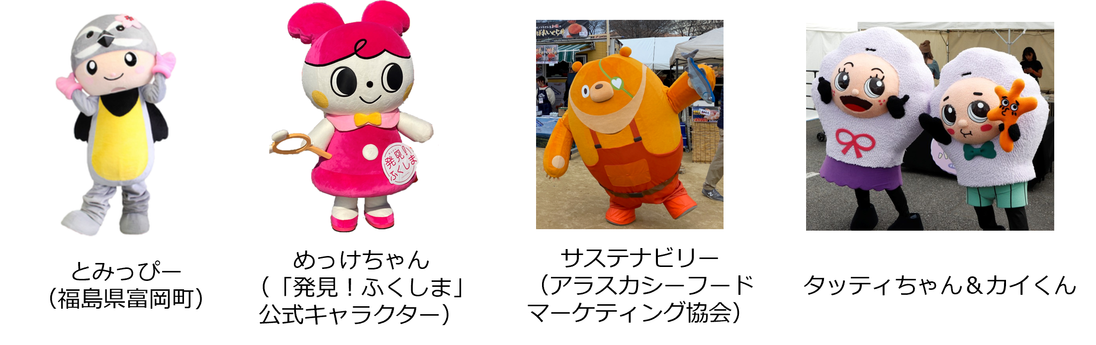 イベント会場には福島県各地のご当地&マスコットキャラクターたちが登場し、イベントを盛り上げます。会期中は会場を歩いたり、それぞれのブースで料理を売り込んだり、ステージにも登場します。