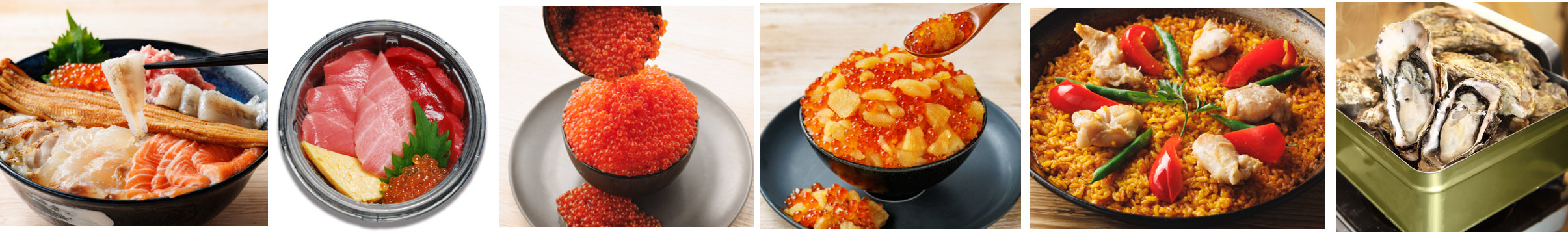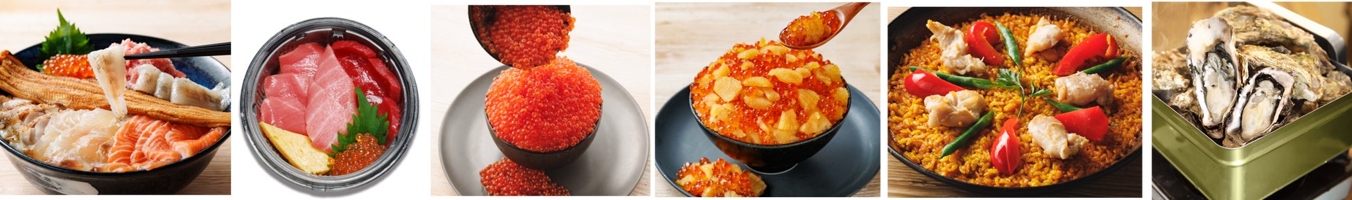 マグロ、サーモン、カニ、イクラ、カキ、ホタテなどの旬で新鮮な魚介が大集合。海鮮丼や漁師飯、郷土料理、鍋料理、海鮮ラーメン、海鮮パエリアなど和洋中のメニューが勢ぞろい。