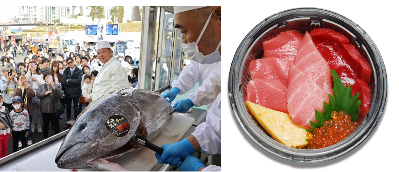 「豊洲かんぺい会」が日比谷に帰ってきます。長崎・鷹島から直送した「生本マグロ」を来場者の目の前で解体。さばいたばかりの超新鮮なマグロの赤身、中トロ、大トロを思う存分に食べ比べられる「大とろ入本まぐろ三色丼」などを提供します。