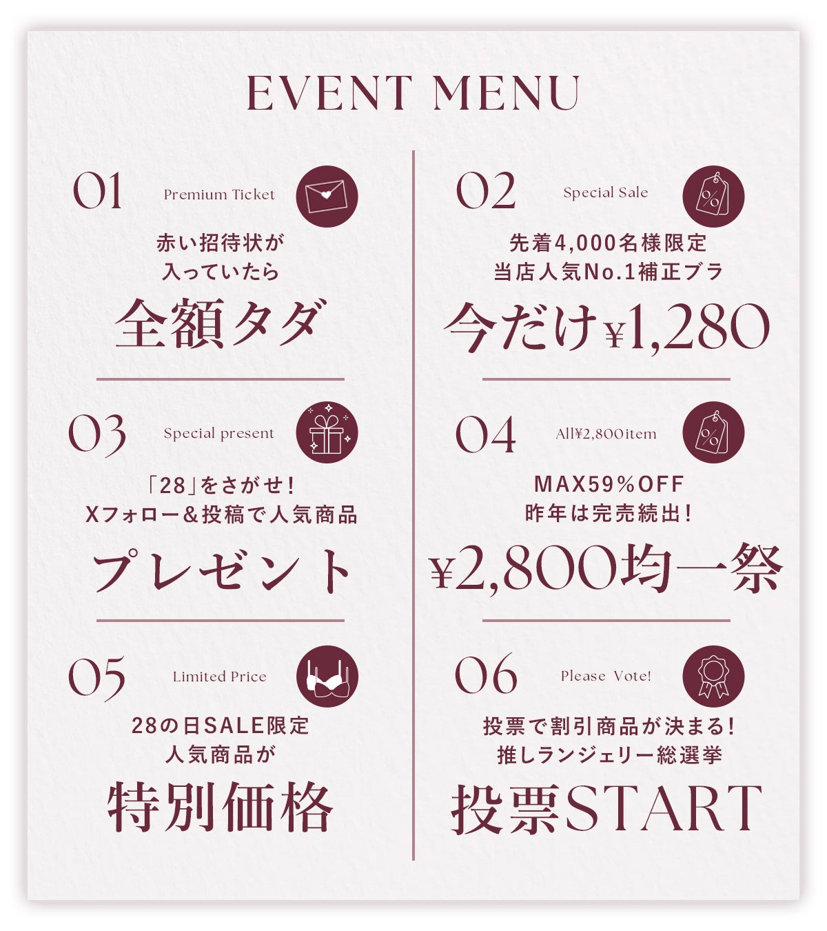 ナイトブラ付きルームウェアが貰えるクイズや、お買い物した方限定でご購入金額がタダになる招待状など、特別企画を沢山ご用意しております。