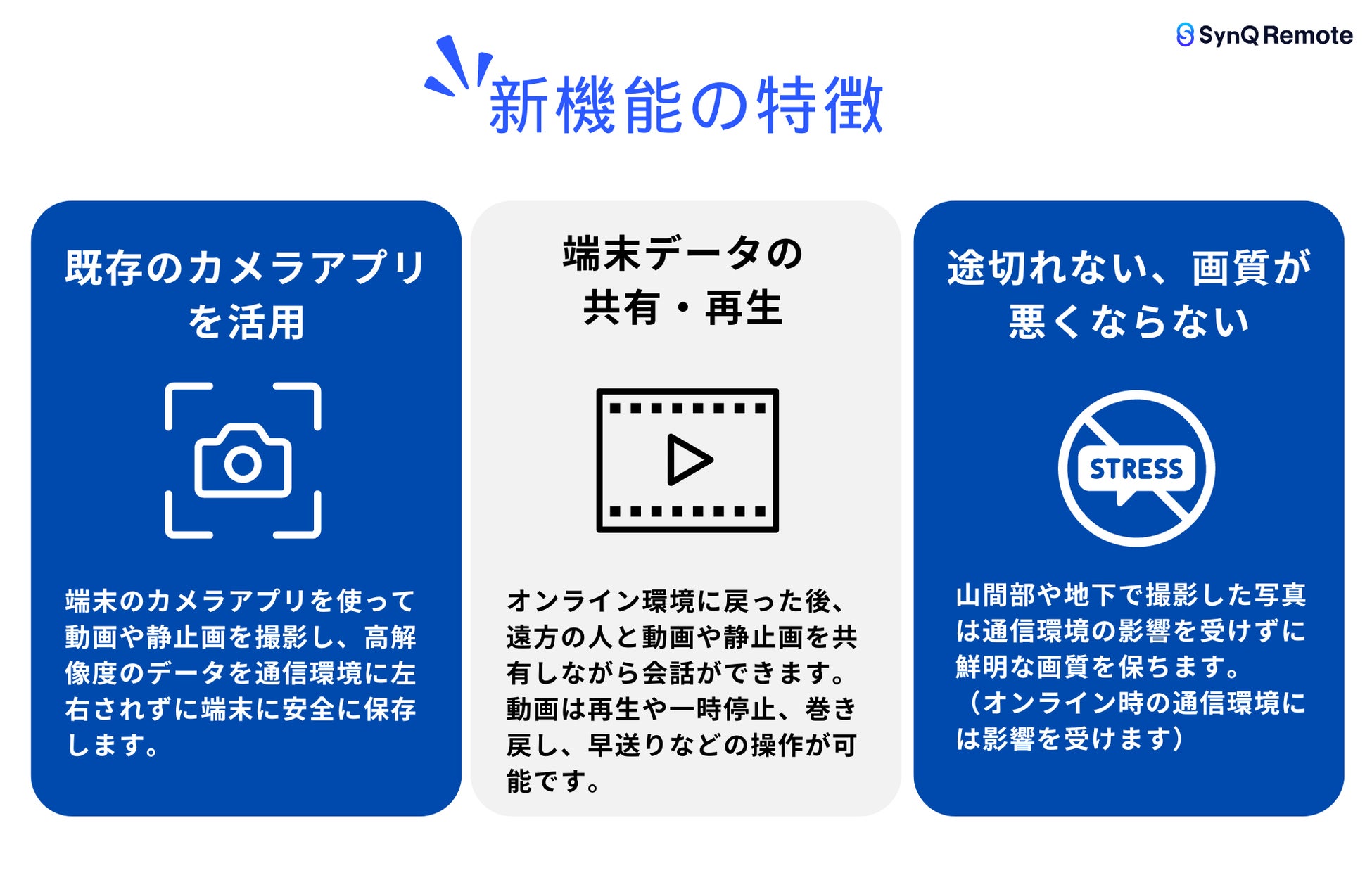 SynQ Remote(シンクリモート)は現場の「あれ、これ、それ」が伝わるビデオ通話ツールです。2020年にリリース後、建設業や設備インフラ業、製造業などを中心にご導入いただいております。日々、ユーザーの皆様の声に耳を傾け、生産性向上のための機能追加とサービス改善を進めております。多くのお客様から「山間部や地下など電波の届かない場所でもシンクリモートを活用したい」「スマホやタブレットの端末にあるファイルを共有しながらシンクリモートで話したい」とのご要望を受けて”端末データ共有機能”の開発に至りました。