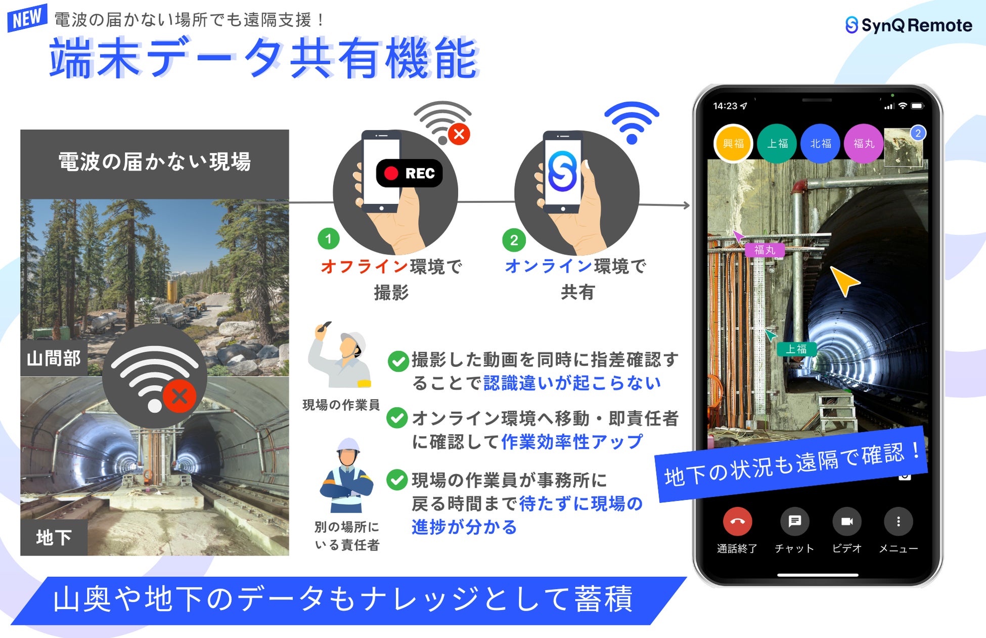 トンネル作業員の高齢化も進む中、若手が不足している現場では労働環境の変化が加速しており、AIやIoTなどの新技術の導入が重要視されてきています。SynQRemoteは属人的な業務を無くして「より少ない人数で多くの現場を、品質を担保しながら動かす」ことを可能にします。1人あたりおよそ1〜2時間かかっている移動時間を減らしてコストを削減しながら働き方改革にも繋がります。今回の「端末データ共有機能(オフライン機能)」で、通信が困難だった山間部や地下などの現場でも、遠隔支援を実現して人手不足を補います。