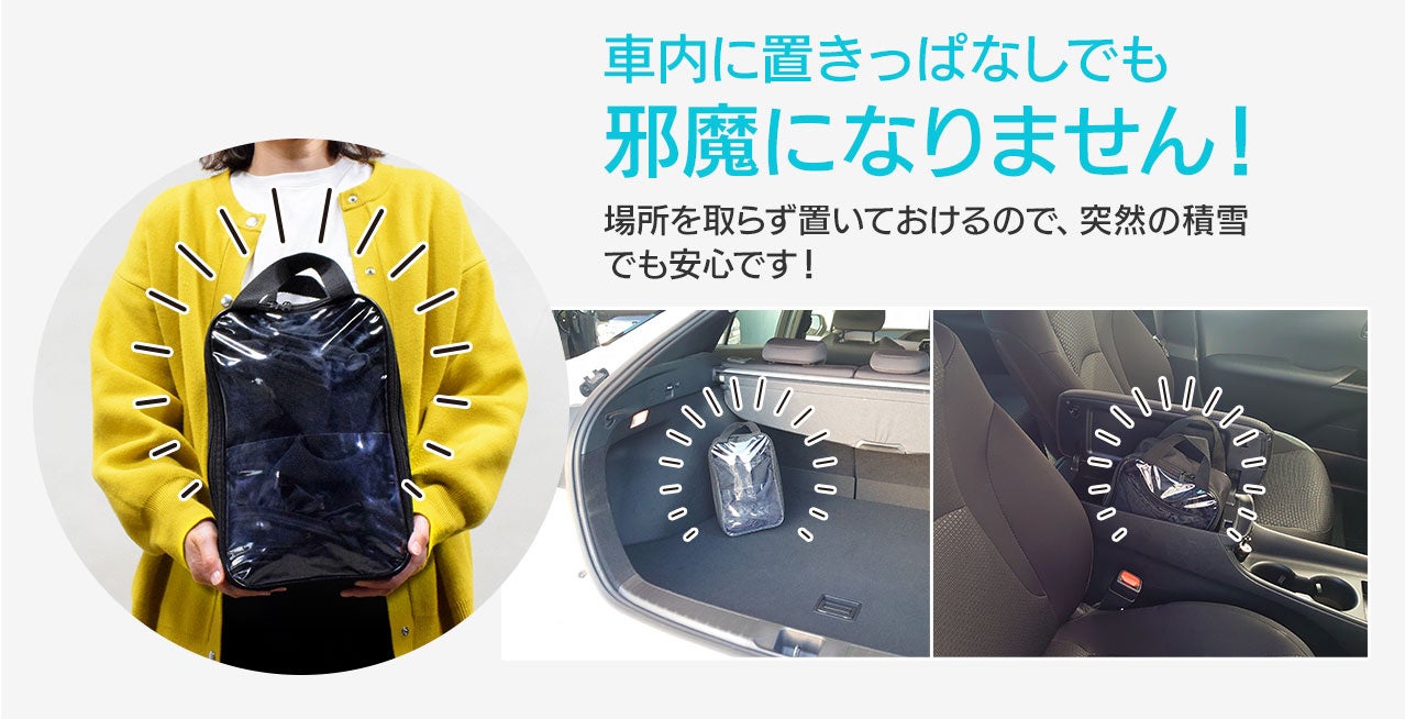 車のトランクなどに置いても場所を取らないので、シーズン中は車に備えておけば、急な積雪に遭遇しても困りません。