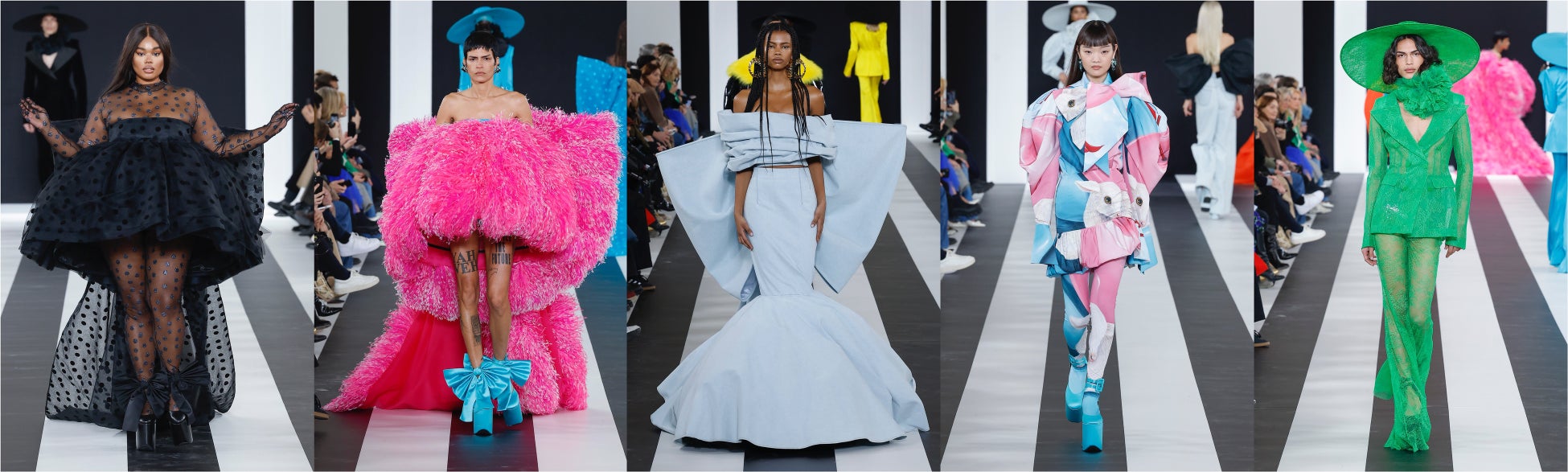 このコレクションはアーカイブに敬意を表しながら、遊び心のあるプロポーションとシルエット、楽観的なカラーパレットと若々しいスピリットを取り入れて、今日のポップカルチャーとの調和を目指しています。テーラリング、イブニングウェア、スポーツウェア、デニムを組み合わせたフェミニニティに溢れるワードローブは、昼間から夜まで活躍。ストライプやチーター柄のフェイクファーで仕立てた、裾を引きずるコクーンシルエットのコートは、スパンコールをあしらったラウンジウェアにぴったりです。イブニングウェアには、目を引くリボンやフィッシュテールをあしらい、ポルカドットやマイクロプリーツのチュールで覆ったタフタ素材のドレスなどが登場。全てのルックは、プラットフォームヒールで高さが加わることにより、コレクションのグラマラスな雰囲気を強調しています。