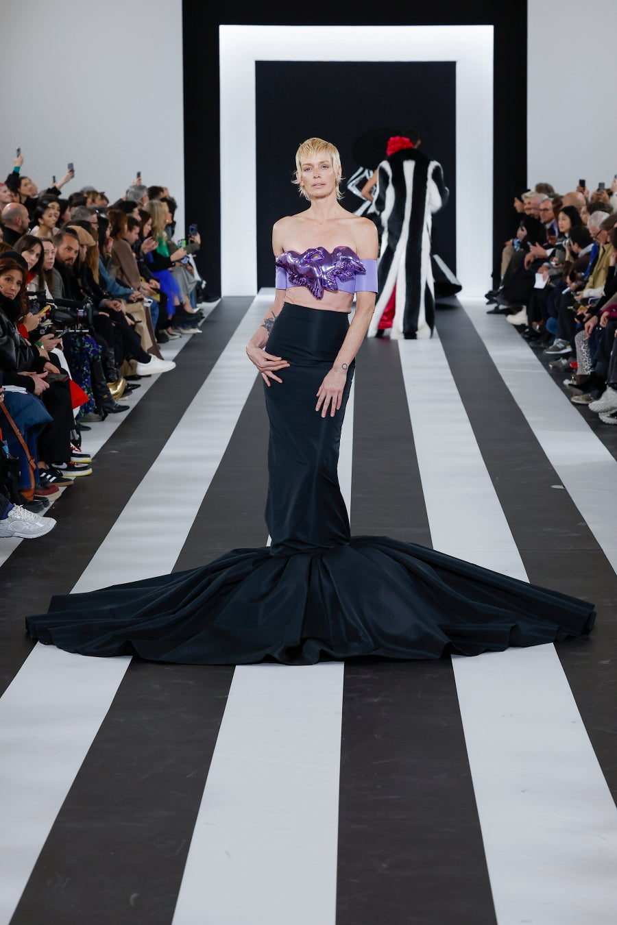 クチュールを彷彿とさせる素材使いは、メゾンアーカイブのテキスタイルを再現。タフタやチュール、シャンティレース、ダブルフェイスのクレープといった煌びやかな素材は、現代の定番であるデニムやレザー、フェイクファーなどと織り交ぜられています。
