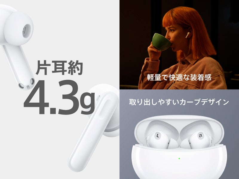 OPPO Enco Air2 Proは、実用的かつ洗練されたデザインを採用しています。大型ドライバーを備えたイヤホンでありながらも、耳にフィットするコンパクトなデザインと片耳約4.3gの軽量設計で、一日中つけていても疲れません。美しい流線を描く全体のデザインは人間工学に基づいて設計されています。