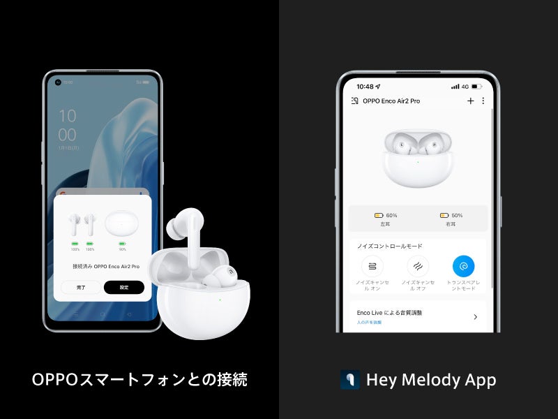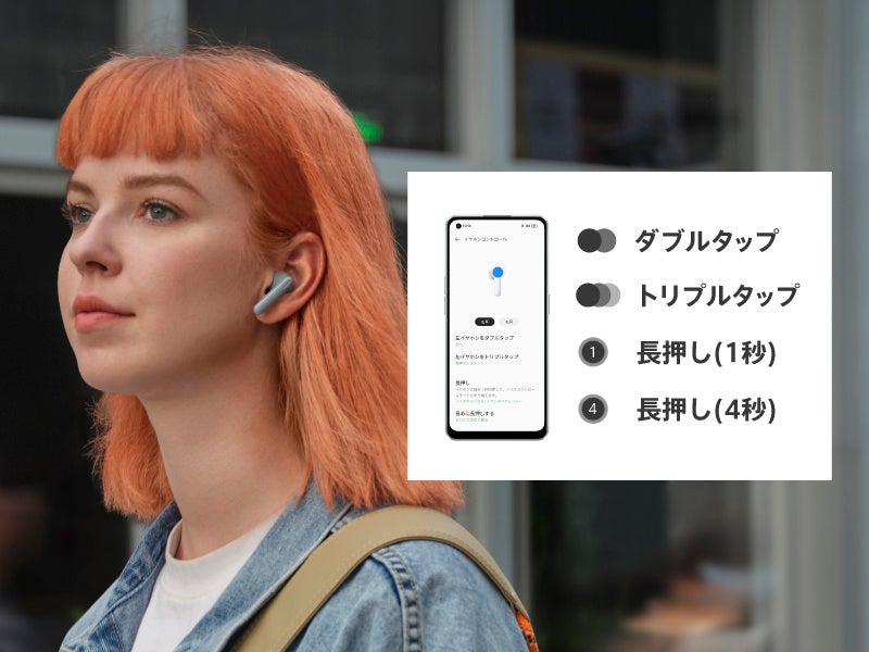 ※4:タッチコントロールの設定はOPPOスマートフォン(ColorOS 11以上)が対象です。Android™ 7.0以上およびiOS 13.2以上のユーザーは、HeyMelodyアプリをダウンロードしてインストールすることでイヤホンの操作設定をカスタマイズすることができます。詳細は製品ページにてご確認ください。