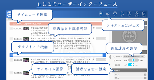 また、番組制作の現場での利用を前提に、タイムコードとの連携・サムネイル画像の表示・話者の設定・メモの挿入などの機能も搭載しており、どなたでも直感的に簡単に操作ができます。