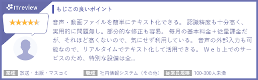 もじこは音声認識の部門で「Leader」を受賞しました。「Leader」は、レビュアーによる満足度評価と市場の認知度を可視化した「ITreview Grid」の中で認知度高く、ユーザー満足度も高い評価の製品に与えられるものです。もじこについて「ITreview Grid」内で、「苦痛から解放された」「業務の効率化・時間短縮に大きく貢献!」「もじおこしの決定版」など、お客様満足度の高いレビューを頂戴しており、お客様から大変ご好評をいただいていたことから今回の受賞に至りました。