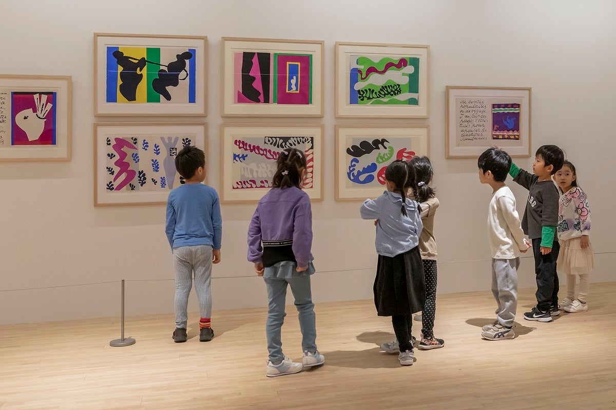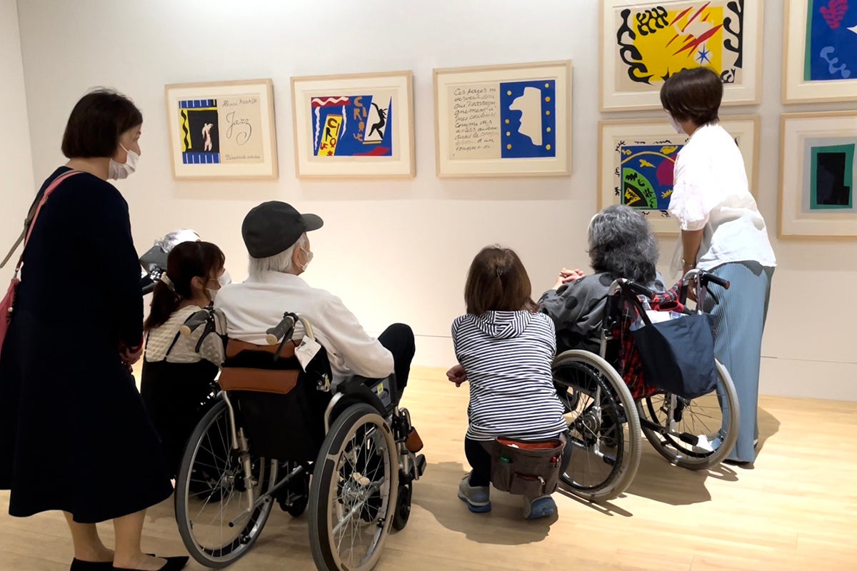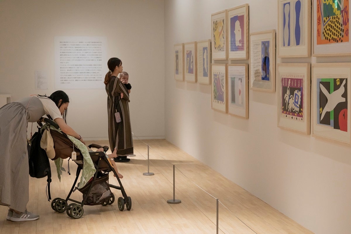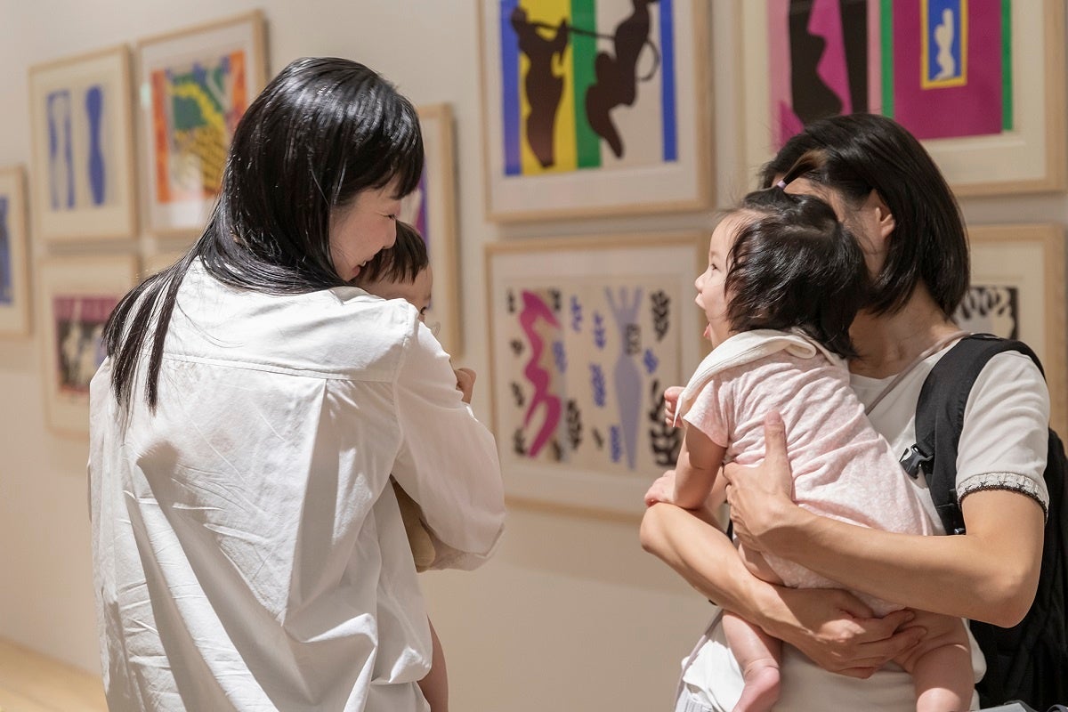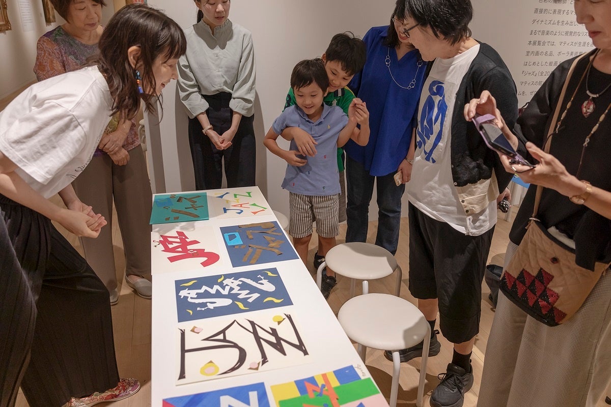 普段ギャラリーから足が遠のきがちな方にも、これを機にご来場いただけるよう赤ちゃん鑑賞会や対話型鑑賞会を実施しました。赤ちゃん鑑賞会ではご家族そろっての来場も多く、ひとつの作品をお子さまと眺め、話しかける様子が見られました。また対話型鑑賞会※では、認知症の方を含む高齢者に向けた会も設け、対話が進むにつれて口数が増え、表現が豊かになる様子がうかがえました。いずれのプログラムも、皆さまの生き生きとした表情から、アートを介することで感性が開いた状態でのコミュニケーションが生まれ活性化する、その作用を感じられる会となりました。この他にも、地域交流の一環として近隣の保育園児を招待したワークショップなど、創作を通じてマティスの魅力を感じていただけるプログラムも実施しています。