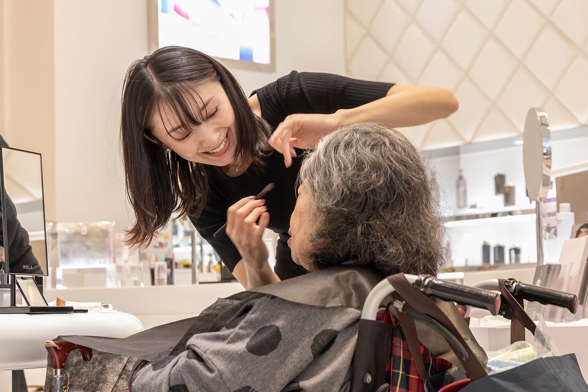 ポーラ ミュージアム アネックスで対話型鑑賞会を行うのは2019年のポーラ銀座ビル10周年展以来、今回で2回目です。前回「鑑賞会に参加するのを楽しみにしていて、今日はおしゃれしてきたんですよ」といったお声があったため、今回は初めて、化粧品メーカーである当社グループならではのサービスとして、ポーラギンザでのメークを鑑賞会前に行いました。プロのメークアップアーティストの手で、肌に触れて、メークしてもらう。それだけで表情がほぐれ、生き生きしたお顔に変わる様子が見られました。