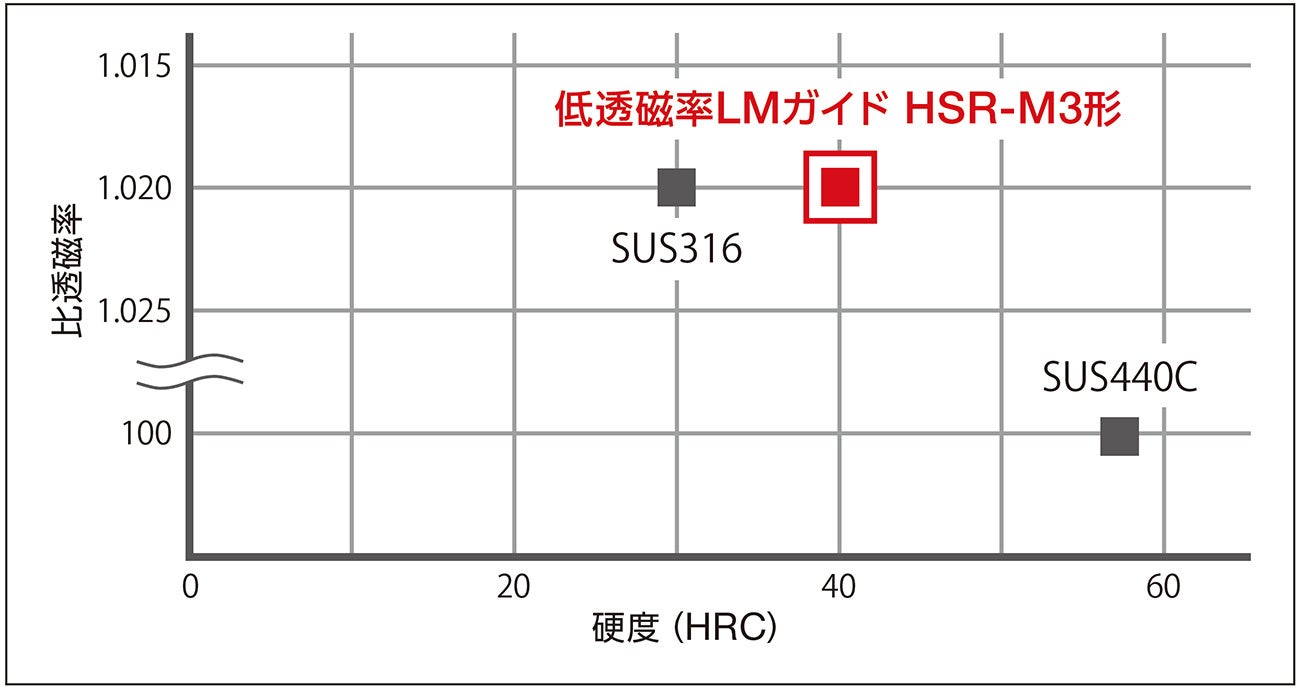 構成部品に低透磁率材料を使用することで比透磁率1.02を達成し、磁場環境下でも製品性能を発揮します。また、40HRC以上の硬度を有しているため、低透磁率材料として知られているSUS316 と比べ大きな荷重を受けることが可能です。